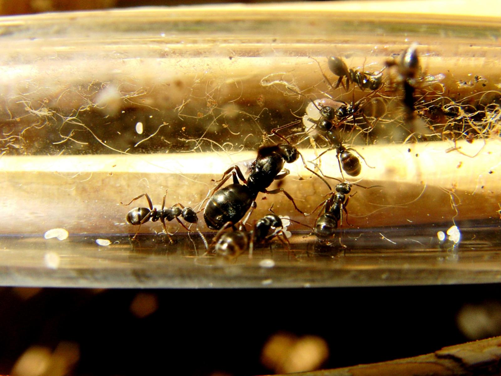 Ich habe seit der letzten Saison eine kleine Formica fusca Kolonie. Ich habe sie nahe meines Wohnortes eingesammelt. Es handelt sich um zwei Gynen mit ca. 20 Arbeiterinnen. Das Volk bestannt aus mind. 5 Gynen.