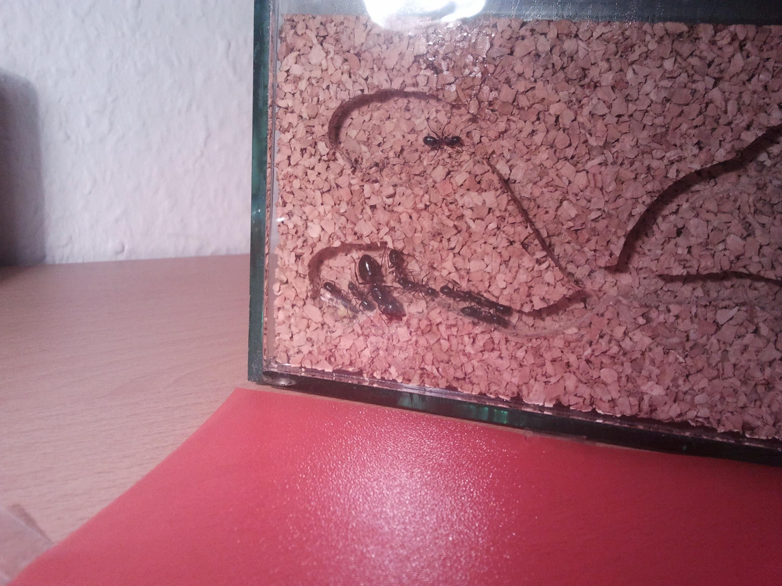 Nach wiederum kurzer zeit wurde dann das, mit einer roten Folie abgedunkelte, Korknest erkundet und auch sehr schnell fĂŒr gut befunden, was einen Umzug innerhalb von ca. 3 Stunden, nach einsetzen ins Formicarium, nach sich zog!