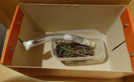 Und hier das Nest. Der Karton wird mit einem Deckel verschlossen. Die Fichtennadeln sollen für die Ameise gut duften (hoffe ich).