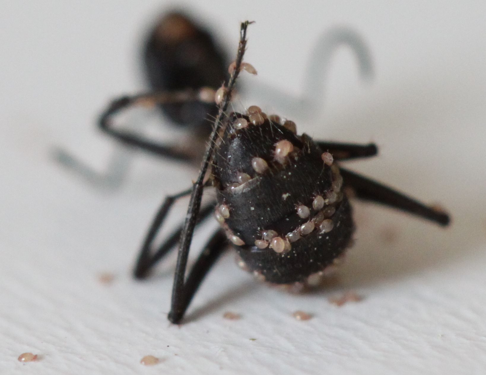 Mit dem bloßen Auge konnte ich nichts erkennen (habe auch leider weder Lupe, noch Mikroskop) aber auf dem Fotos scheint die Ameise weiße Punkte zu haben (wenn man ranzoomed gut zu erkennen):