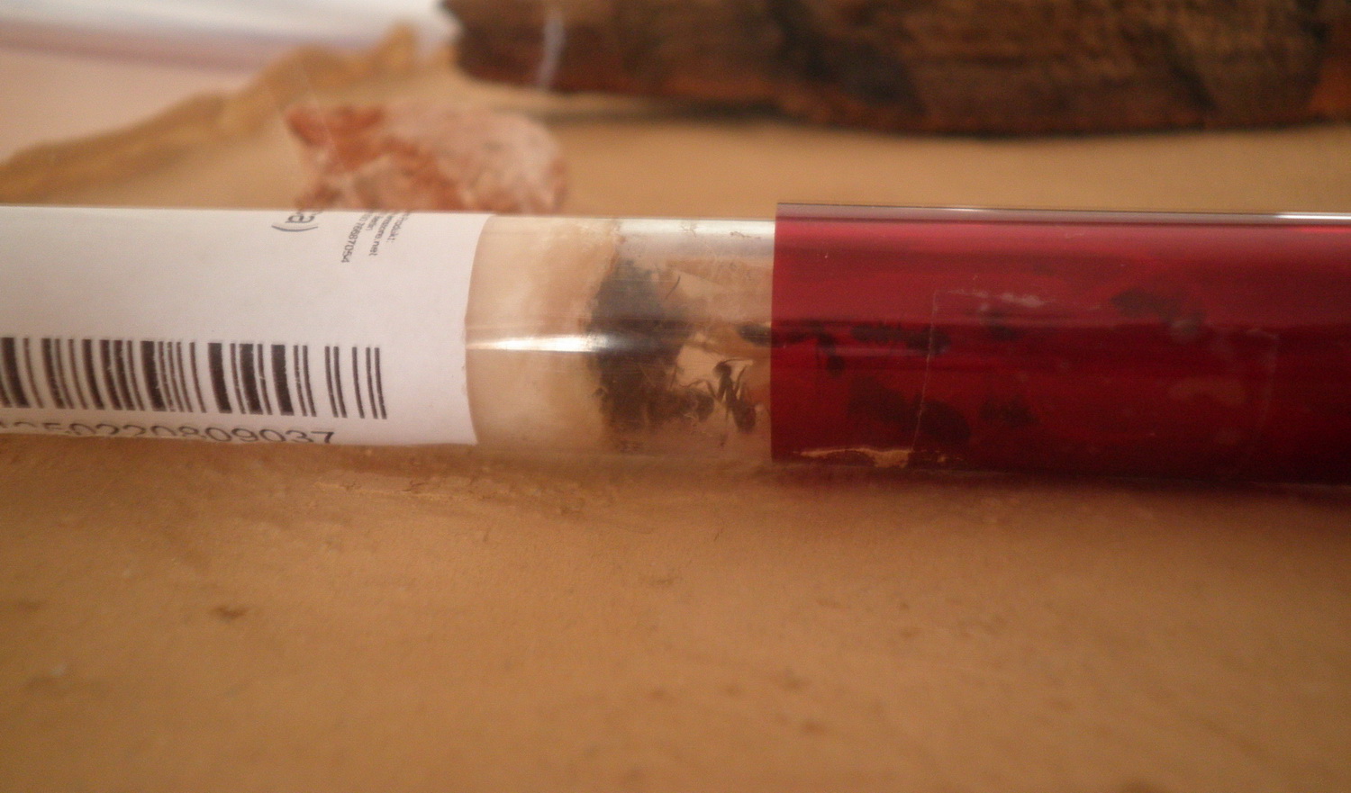 Seit längerer Zeit steht den Ameisen ein Y-Tong-Nest zur Verfügung, was bisher ignoriert wurde. Zusätzlich habe ich vorhin ein neues Reagenzglasnest in die Arena gelegt, in der Hoffnung, meine Schützlinge werden ihr momentanes Heim aufgeben.