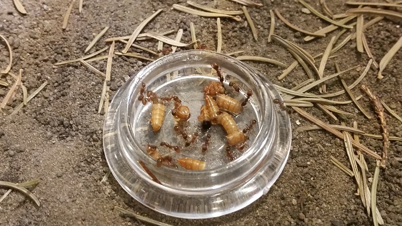 Ich verpflegte wie jeden Tag meine kleine Kolonie. Wassertank des Nestes auffüllen, Honigwasser austauschen und einen Napf mit drei zerschnittenen Mehlkäfer Larven rein.