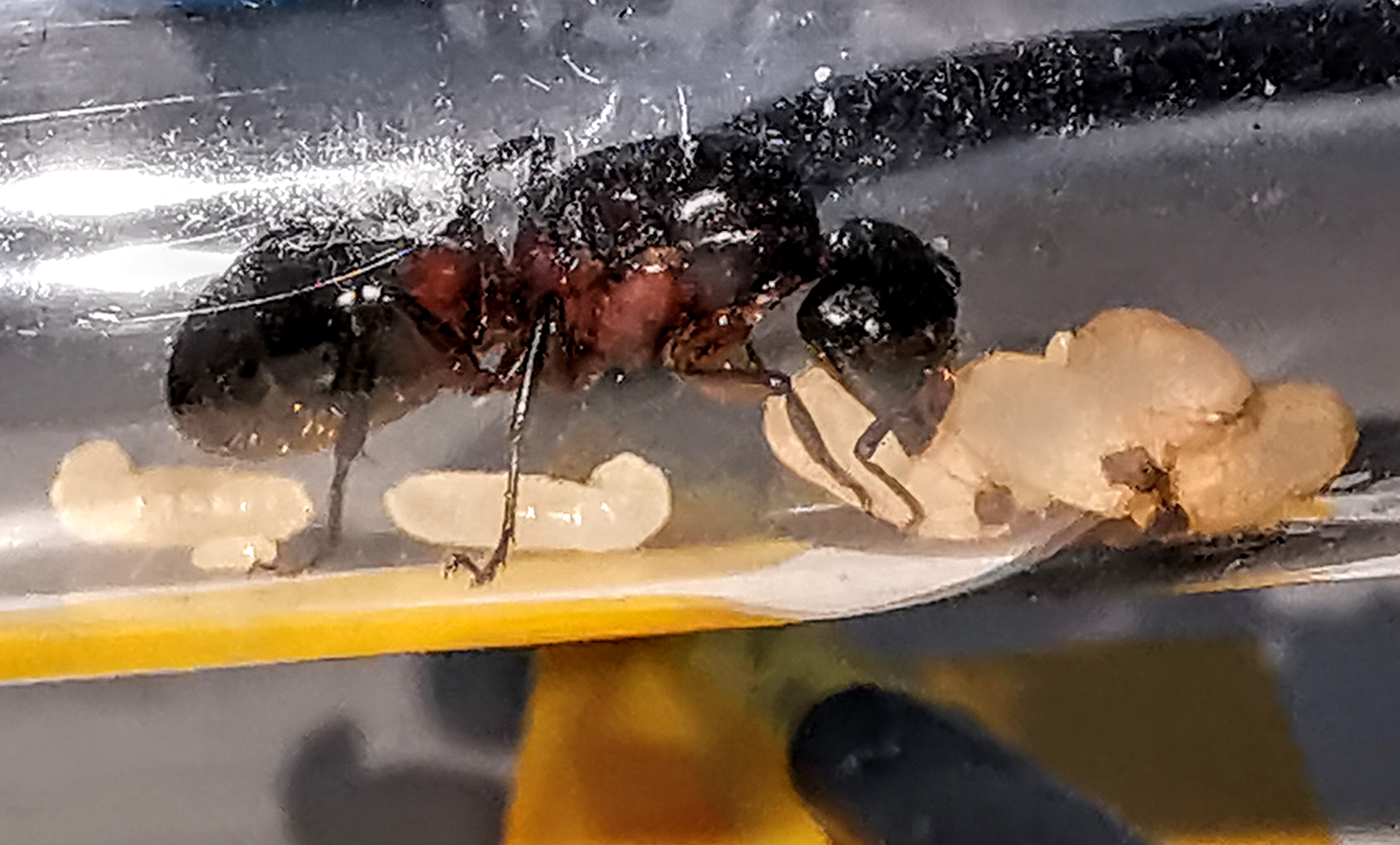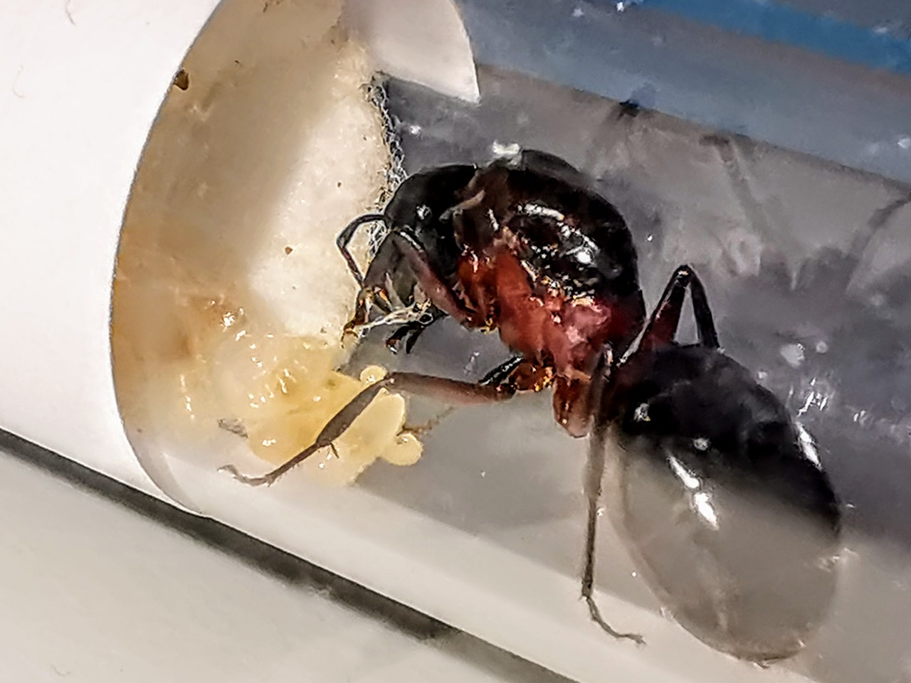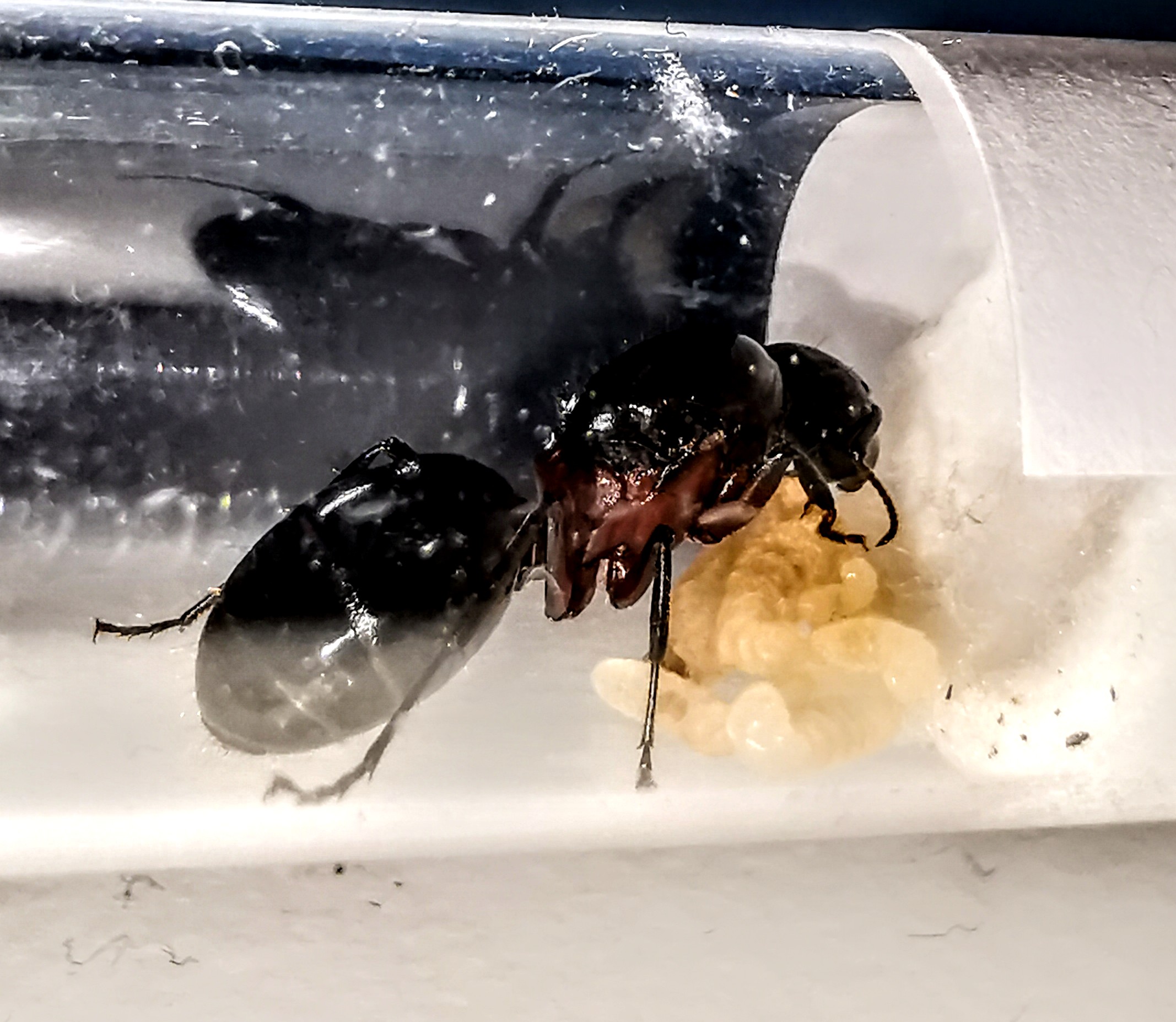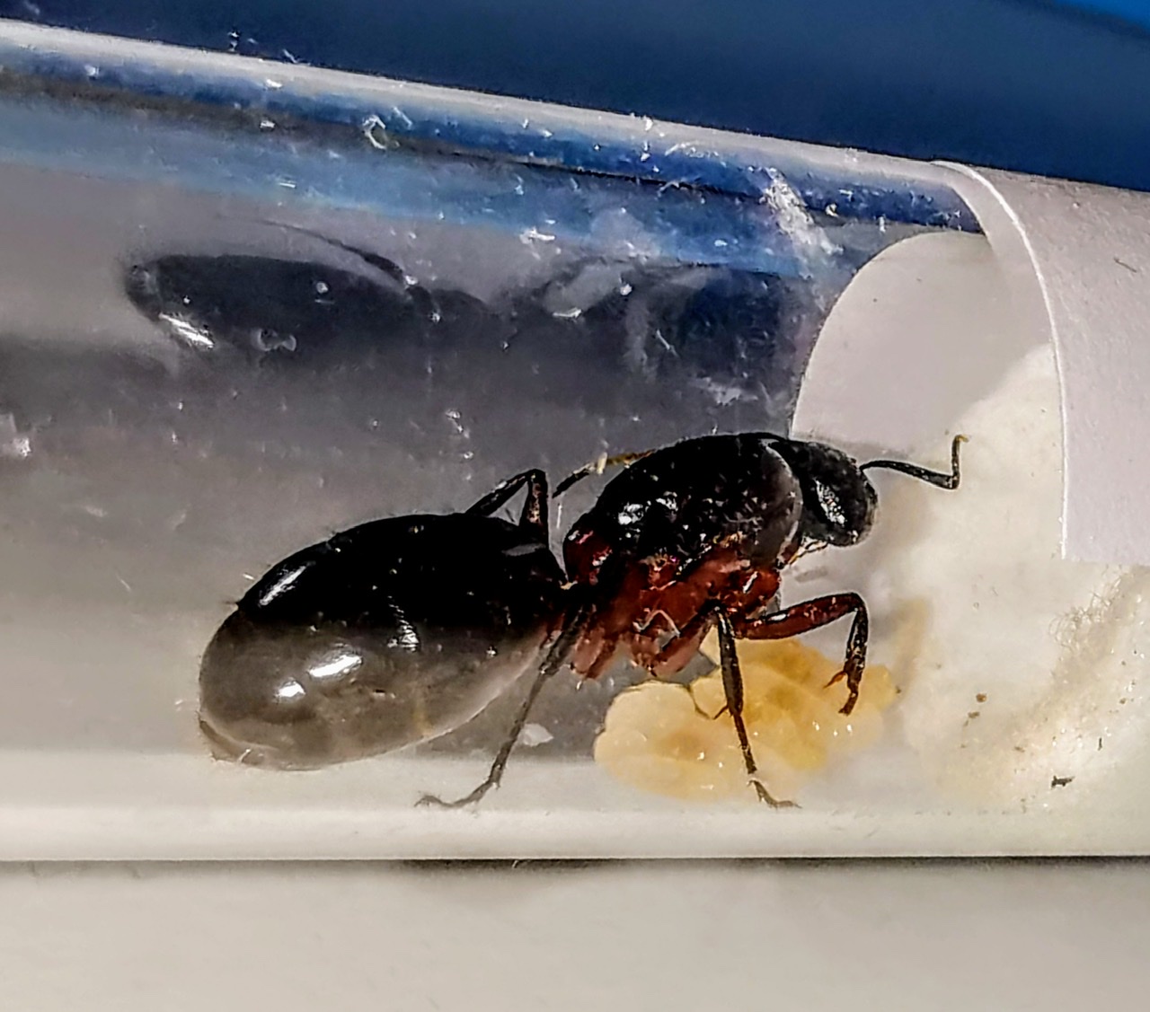 Hab vor ein paar Wochen eine Camponotus ligniperda Königin mit Brut erhalten. Die Winterruhe hat sie inzwischen beendet und sie wird jetzt bei 22C gehalten.