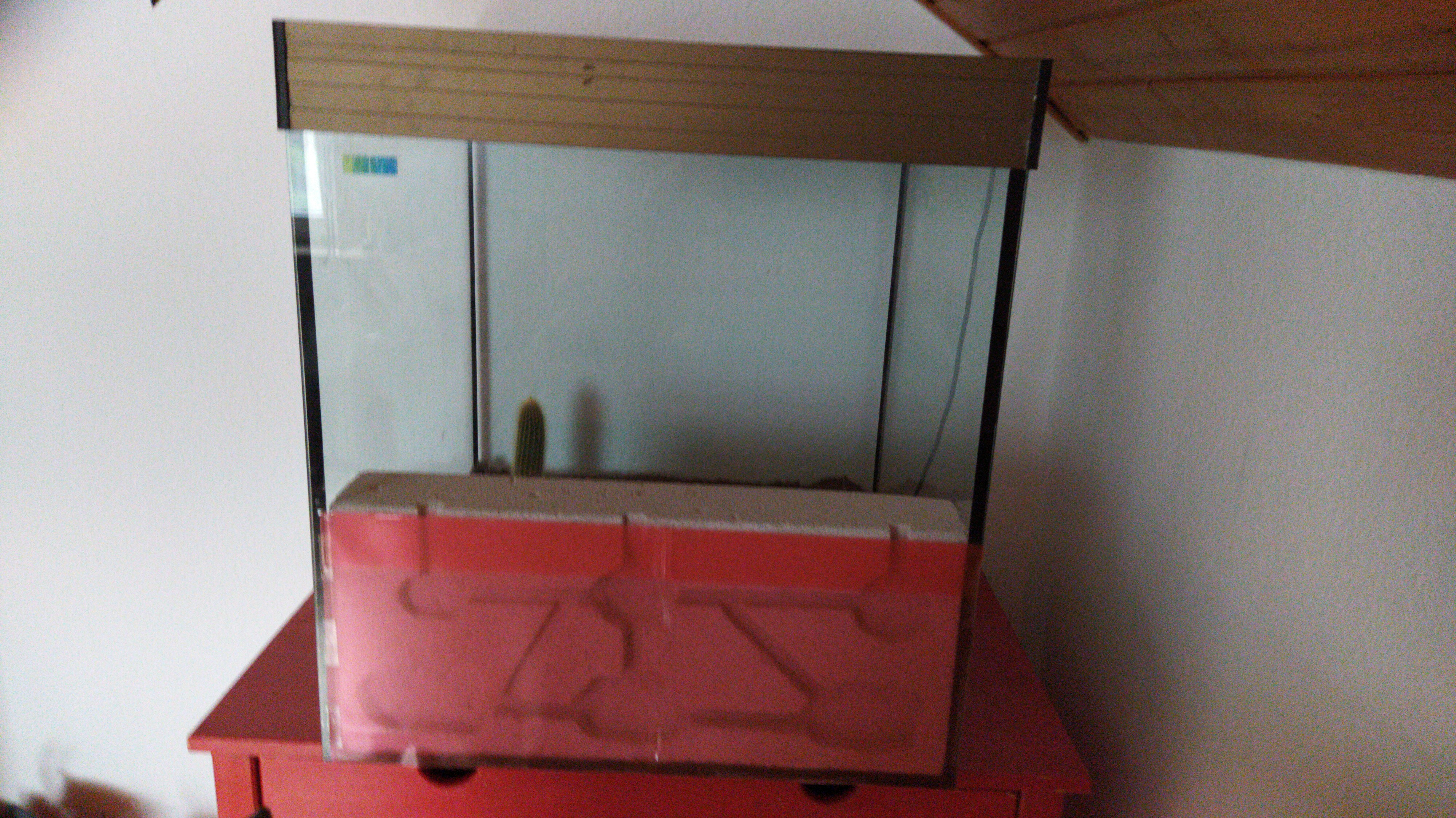 Zu groß ist es nicht. Es ist nur viel zu viel Bodengrund in der Arena, die ziehen lieber da ein als in den Ytong. Du solltest den Hohlraum hinter dem Ytong ausfüllen, zb mit Styropor bis 3,4 cm unter dem Rand vom Ytong. Dann am besten eine Schicht Gips gießen bis Oberkante Ytong. Darauf dann maximal 1cm Bodengrund. Das Nest solltest du eventuell bis nach der kommenden