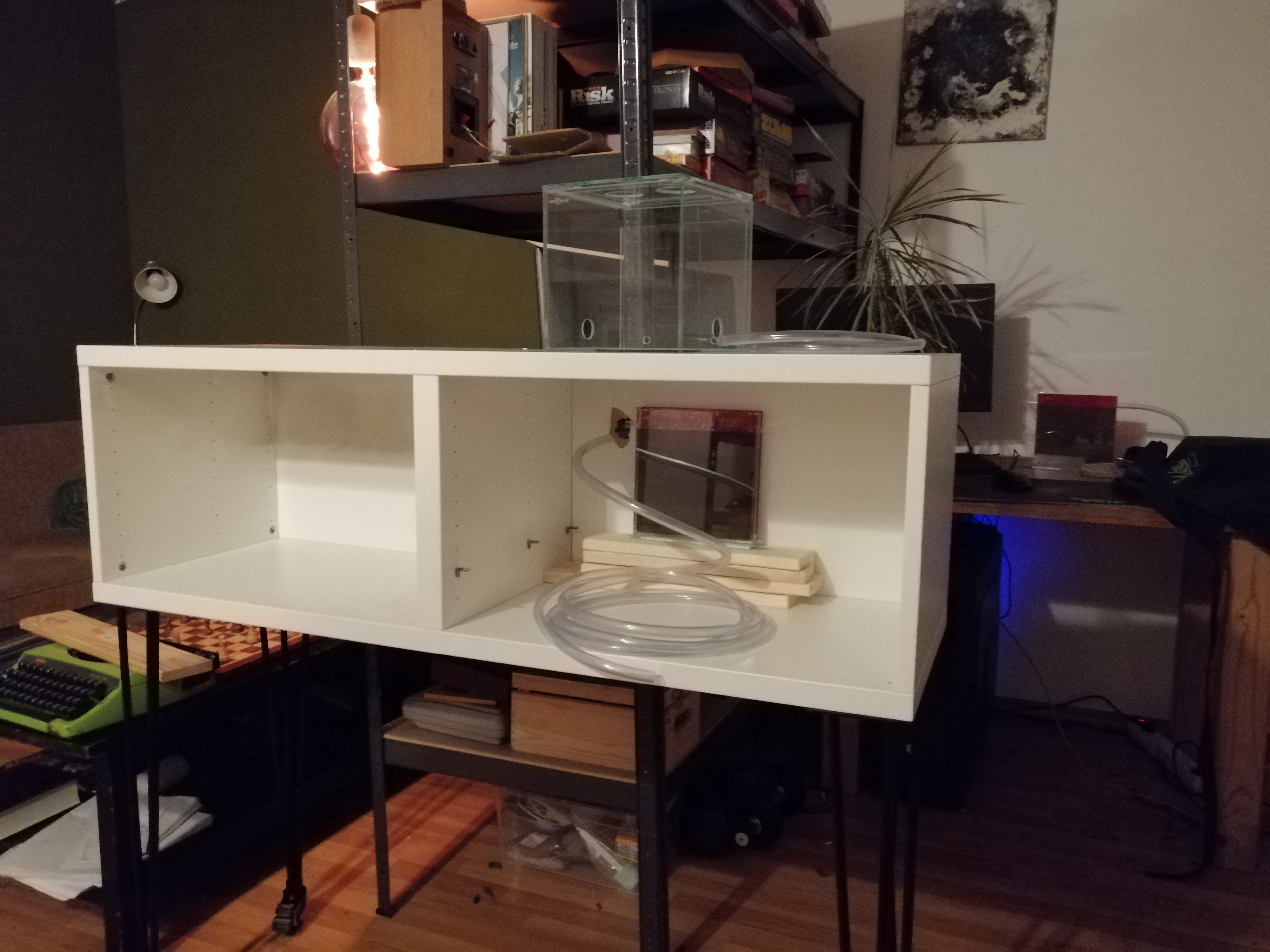 Heute ist endlich mein Ameisen Schrank fast fertig geworden. Wie auf den Bildern zu sehen ist der Schrank zweigeteilt. Der weiĂe "Raumtrenner" in der Mitte ist verschiebbar. Der rechte Raum soll noch etwas verkleinert werden und ist fĂŒr meine Messor barbarus Nester gedacht. Auf dem Schrank die Arena und dann geht es mit dem Schlauch hinunter in die Nester.