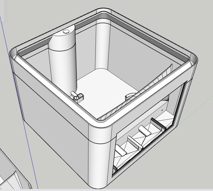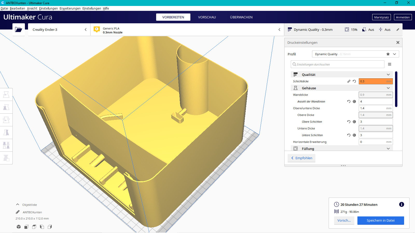 Nun hab ich ein paar Videos geschaut, eine neue Behausung im 3D Drucker gezeichnet und ausgedruckt. 210×210mm Grundfläche und 145mm hoch.