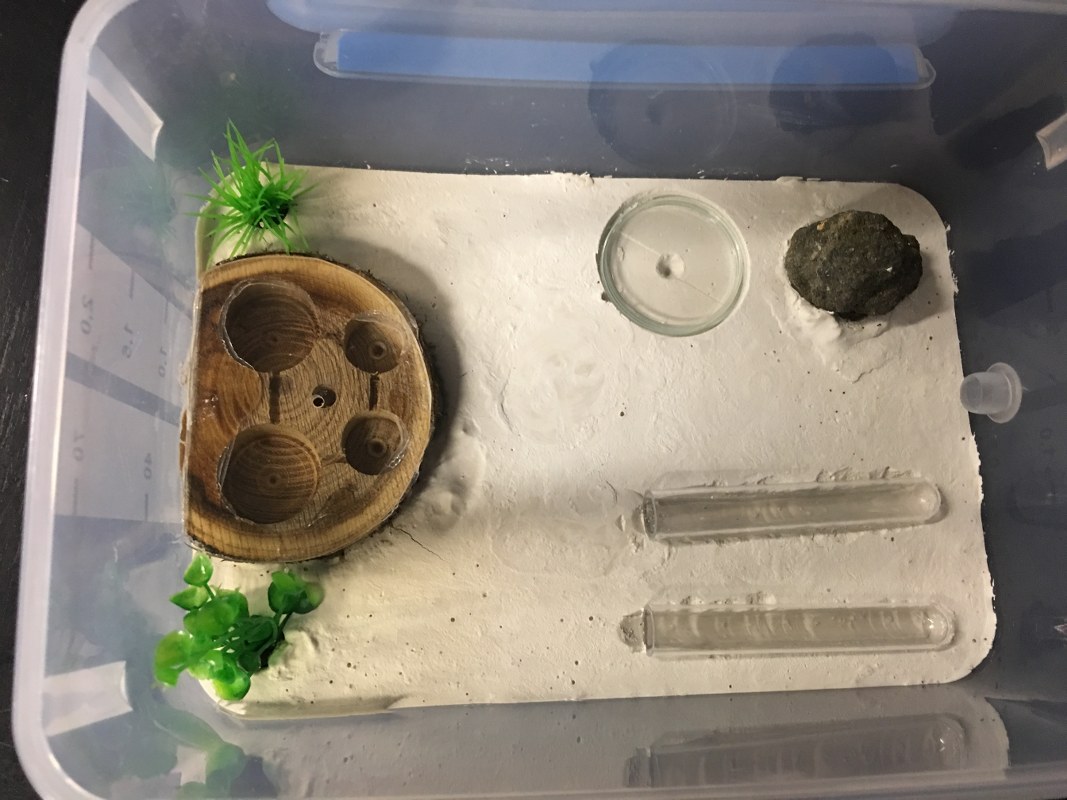 Zwei kleine Kunststoff RGs als Tränken für Wasser & Invert, eine Münzdose als Napf, jeweils etwas in den Gipsboden eingelassen.