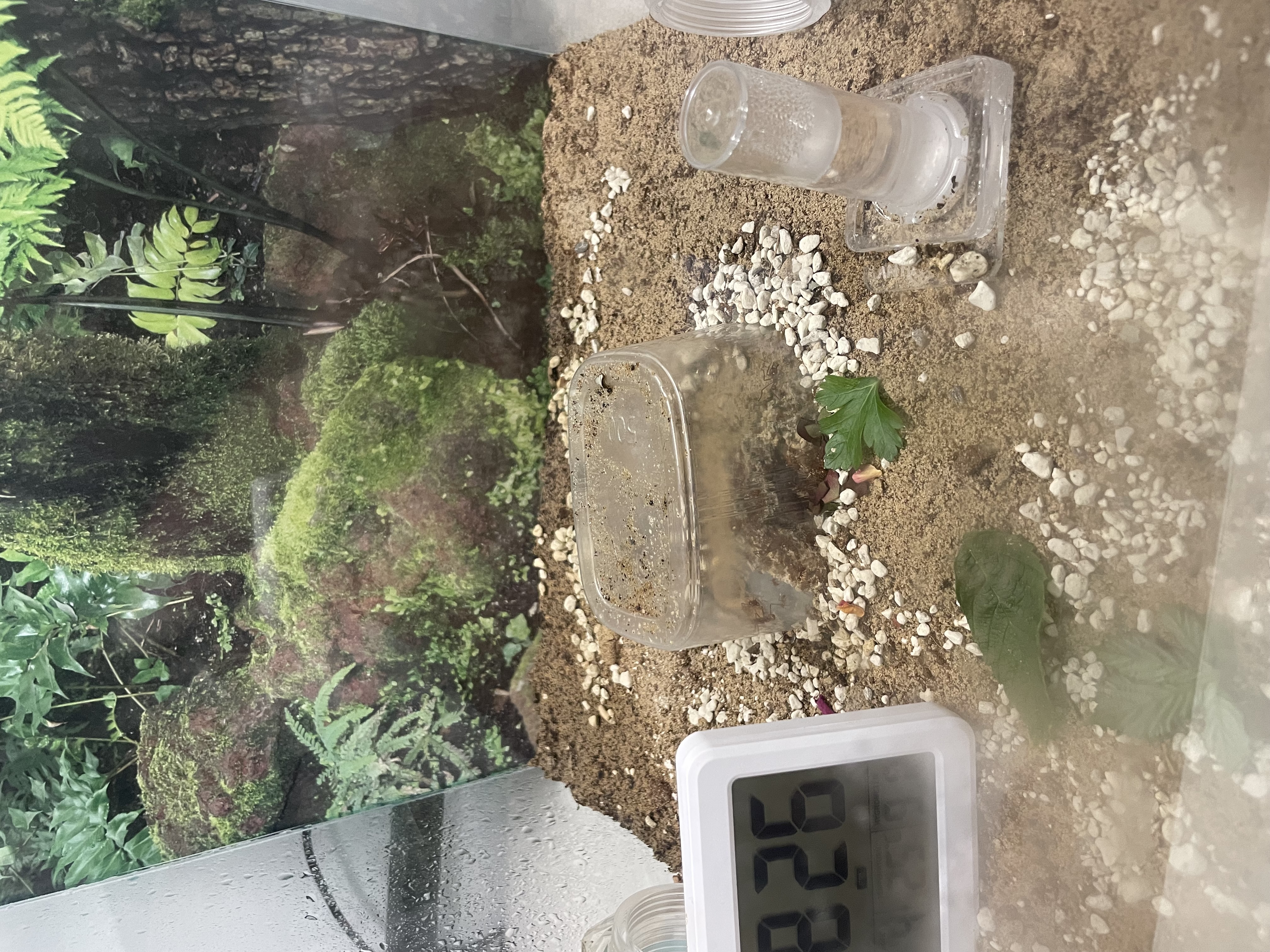 Wir haben die Plastikhaube seit dem Aufstellen im Becken kein einziges Mal bewegt, und innen hat sich auch kein Kondenswasser gebildet. Es wirkt von auĂen vielleicht so, aber tatsĂ€chlich ist es im Inneren komplett trocken. Eine kleine Himbeere habe ich bereits angeboten, die wurde an der Seite etwas angeknabbert. Ich habe sie am nĂ€chsten Tag entfernt, um Schimmelbildung zu vermeiden, habe mich nicht getraut es nochmal zu machen- soll ich? Ich werde weiterhin verschiedene BlĂ€tter ausprobieren und auch versuchen, die Temperatur etwas zu erhöhen. Wir haben eine Heizmatte, die an der hinteren Glasscheibe angebracht ist, jedoch nicht direkt unter dem Pilz.
