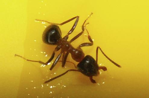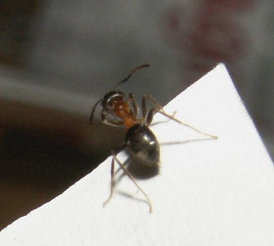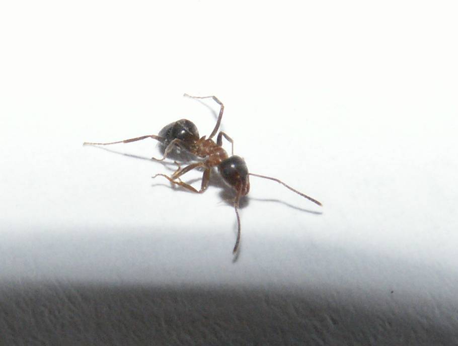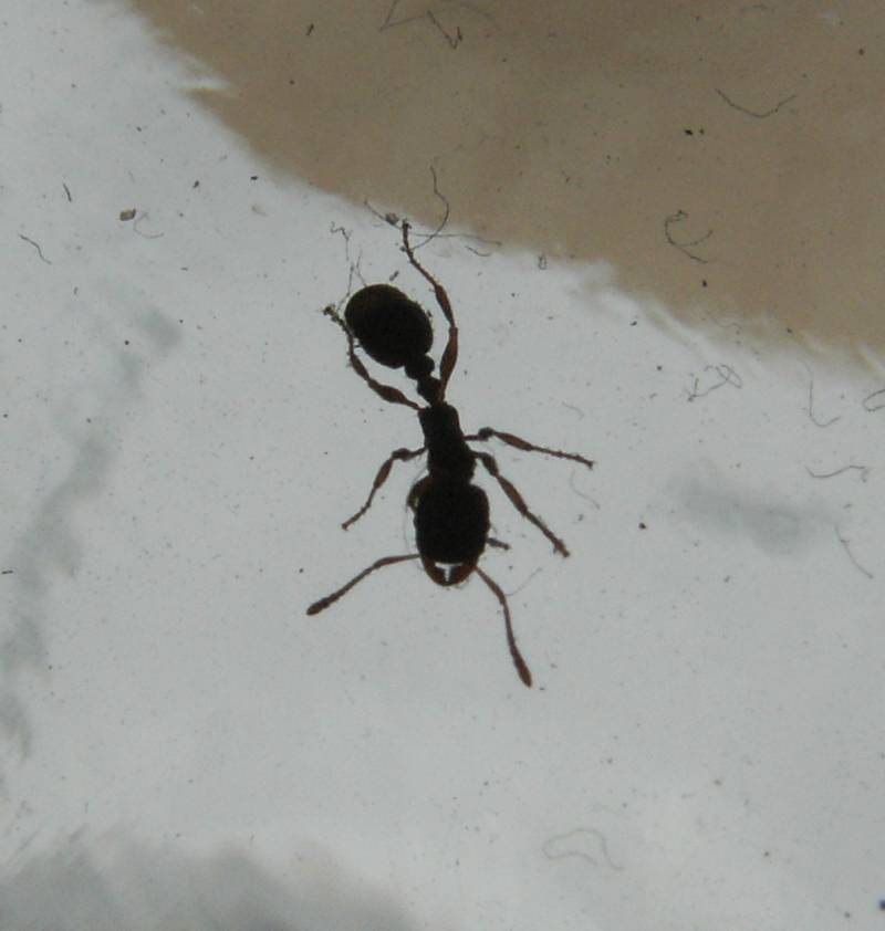 So zur 1. Art: Die Arbeiterinnen sind 0,3-0,4 cm lang. Ihre Gaster ist schwarz, der Thorax ist hell rot brĂ€unlich. Der Kopf ist auf der Oberseite ebenfalls schwarz und auf der Unterseite ist er dunkel rot brĂ€unlich. Außerdem ist die Gaster sehr groß im Vergleich zum restlichen Körper. Sie bewegen sich sehr ruckartig und sehr schnell. Die hinteren Beine sind fast gleich lang wie die FĂŒhler, wenn das irgendwas hilft zur Bestimmung und sie sind sehr selten zu sehen. Woraus ich schließe das sie sehr scheu sind. Bei den Bildern habe ich die Ameise auf eine klebende OberflĂ€che geben mĂŒssen, weshalb man nicht alle Beine sieht. Die 2. Art war leichter zum Forografieren weil sie nicht so schnell ist.
