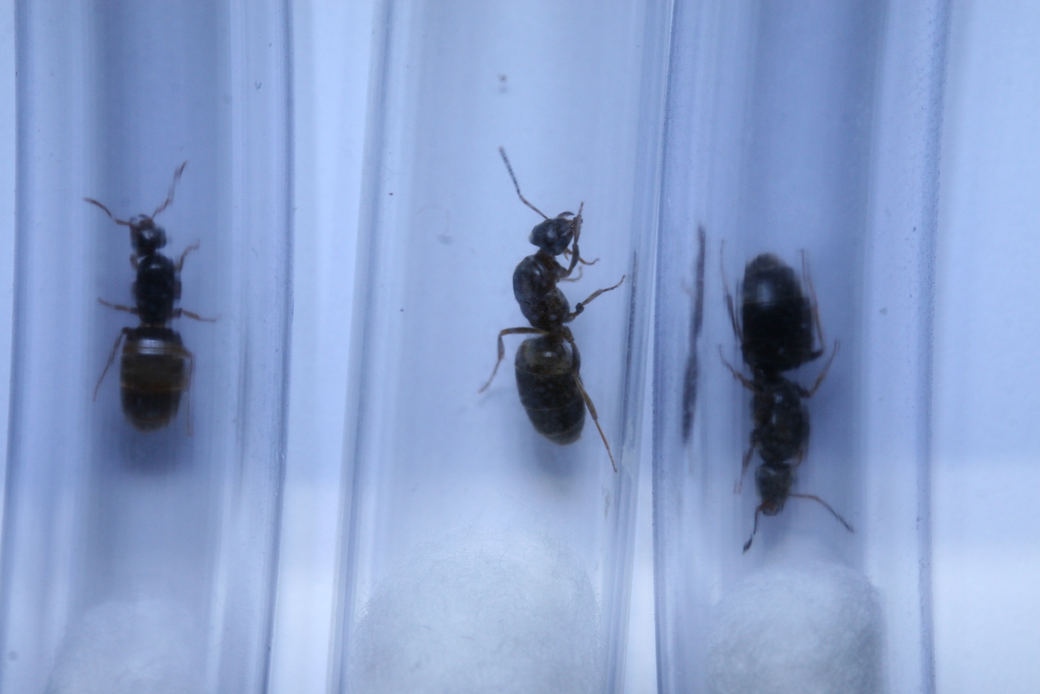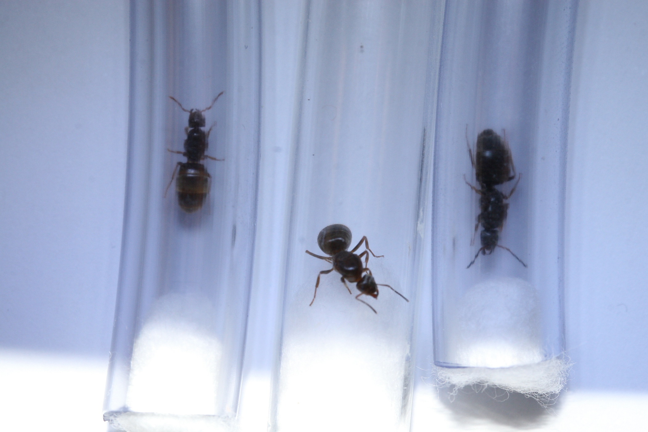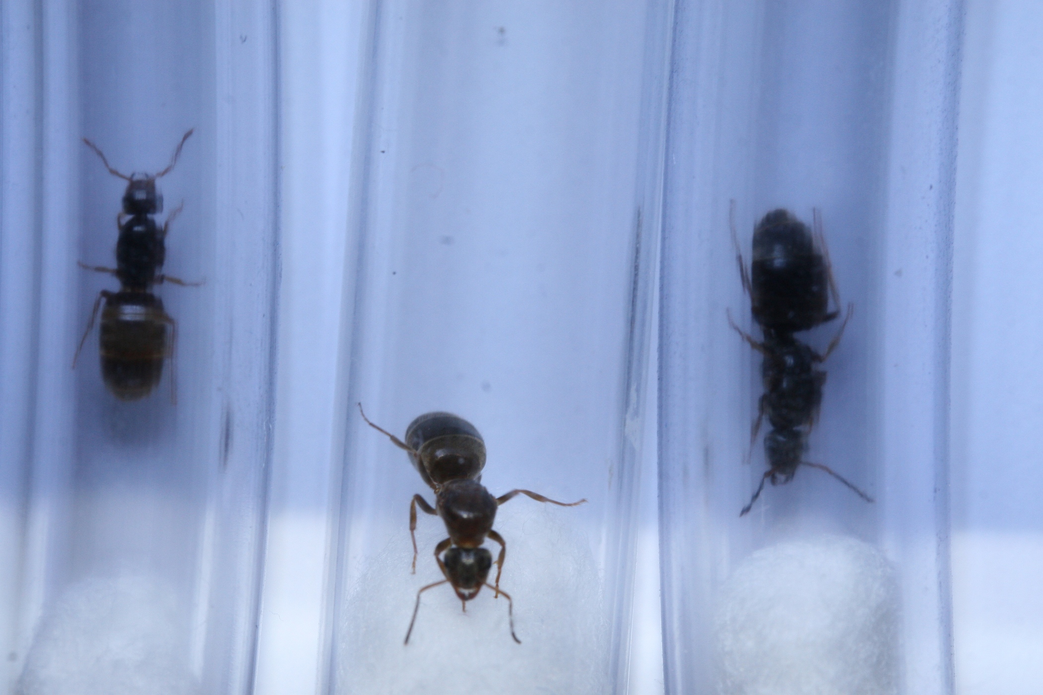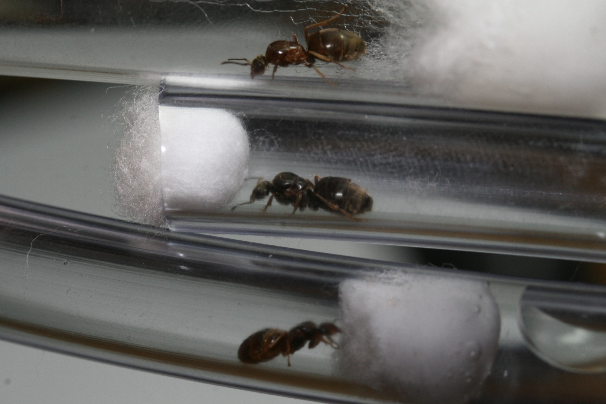 Ich hatte versucht sie an einem Tropfen Honig außerhalb der Reagenzgläser zu bekommen. Allerdings war nur die Lasius niger Gyne interessiert.