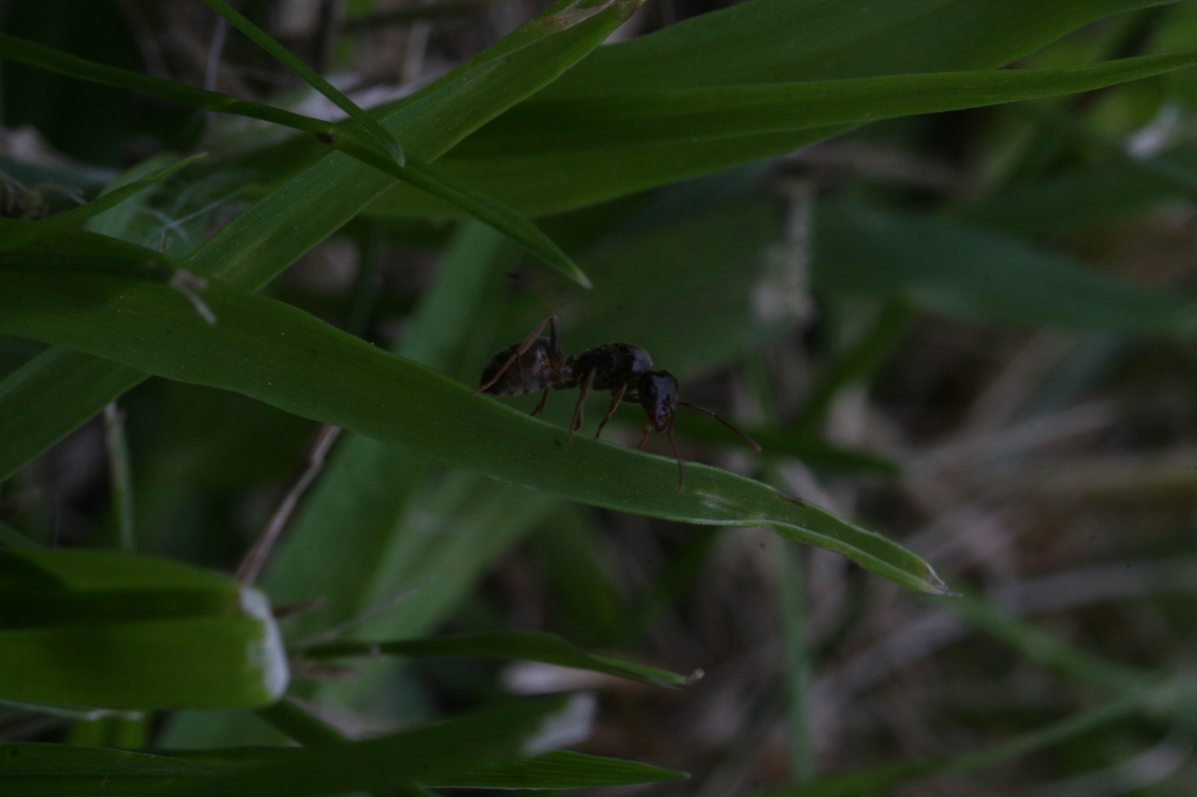 Zu guter Letzt noch ein Photo einer mir unbekannten Gyne. Ich stells mit hier rein, da ich wiederum mal wieder mutmaße, daß es eine Lasius spec ist. Zumindest bin ich mir recht sicher :) daß es eine sozialparasitisch gründende Art ist, da sie sich in der Nähe einer Lasius niger Kolonie aufhielt und sich kurzerhand eine Arbeiterin schnappte. Vielleicht um den Nestgeruch anzunehmen. Sie hat die Größe der Lasius niger Gyne, ist allerdings sehr viel schlanker und agiler. Insbesondere die Gaster ist sehr viel schmaler.