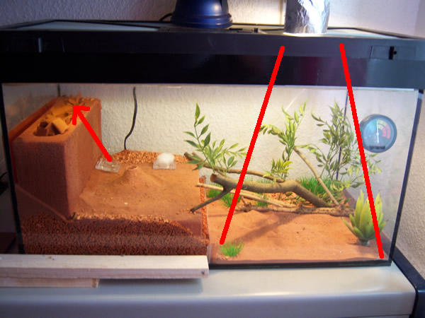 Ich hänge ein paar Bilder an. Man kann gut sehen dass der Sammelplatz ausserhalb der Wärmezone ist. Die Beleuchtung dort ist eher gering. Auch die Feuchte ist dort weder am höchsten noch am niedrigsten. Mir scheint es ebenso wenig oder viel feucht zu sein wie an einigen anderen Stellen.