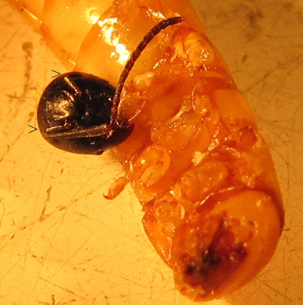Bei stĂ€rkerer VergröĂerung (Bild) ist zuerkennen, dass sich dieser Kopf noch im Mehlwurm verbissen hat, dass die linke Antenne im Schaft durchgebissen ist und fehlt, und dass die rechte Antenne praktisch an derselben Stelle fast durchgebissen und scharf abgeknickt ist (durch die zwei Pfeile markiert).