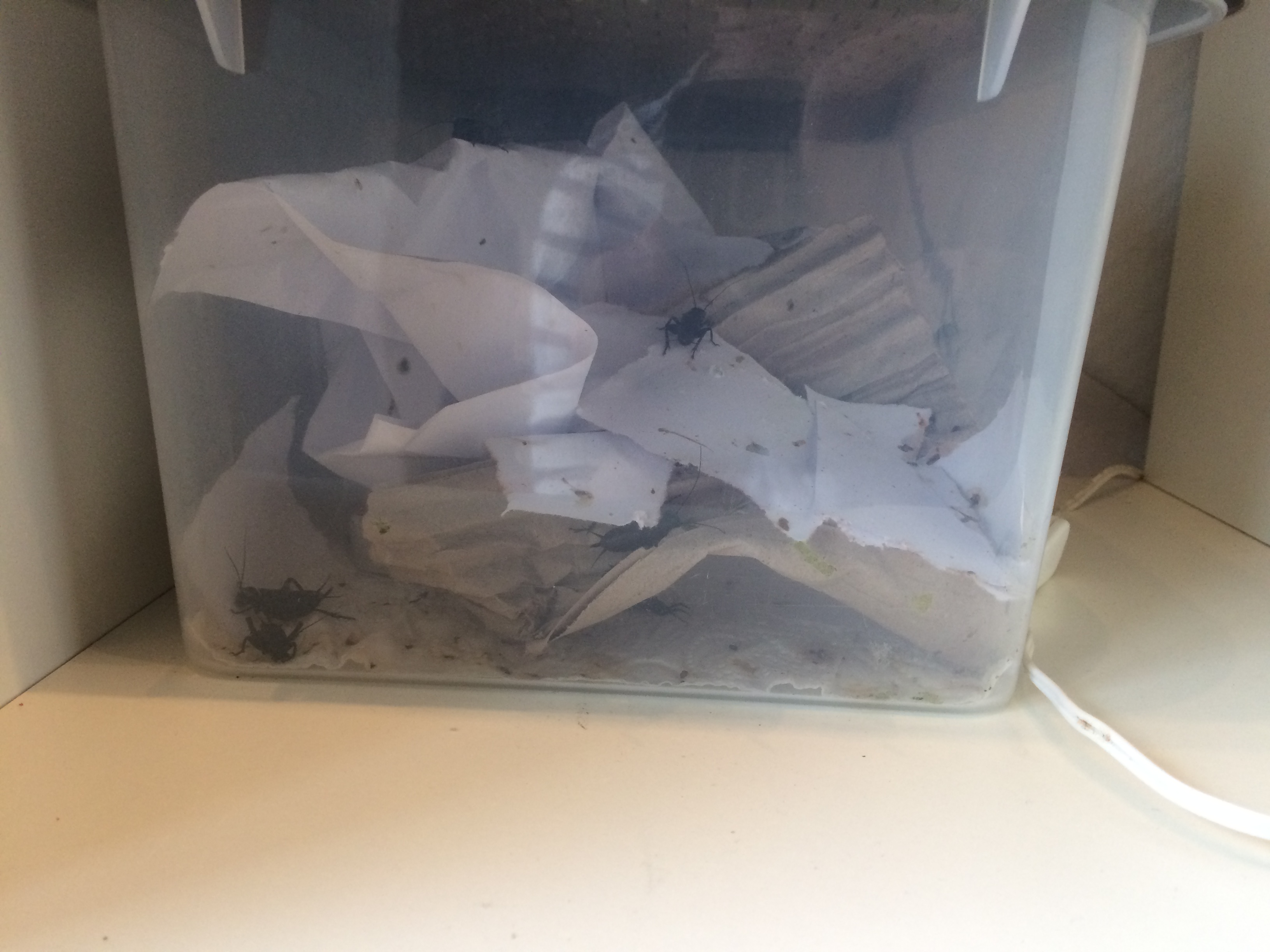 Da ich aber dieses Jahr sehr viel unterwegs bin, somit auch jemand anderes sich um die Tierchen kümmern soll und das ohne großen Aufwand zu betreiben, habe ich mich für eine Mittelmeergrillen-"Zucht" entschieden. Derzeit sind es 25 Grillen im Wachstum, die in einer einfachen Plastikbox mit zerknülltem Papier leben. Sie werden mit Fischfutterflocken, Haferflocken, Obst und Gemüse gefüttert.