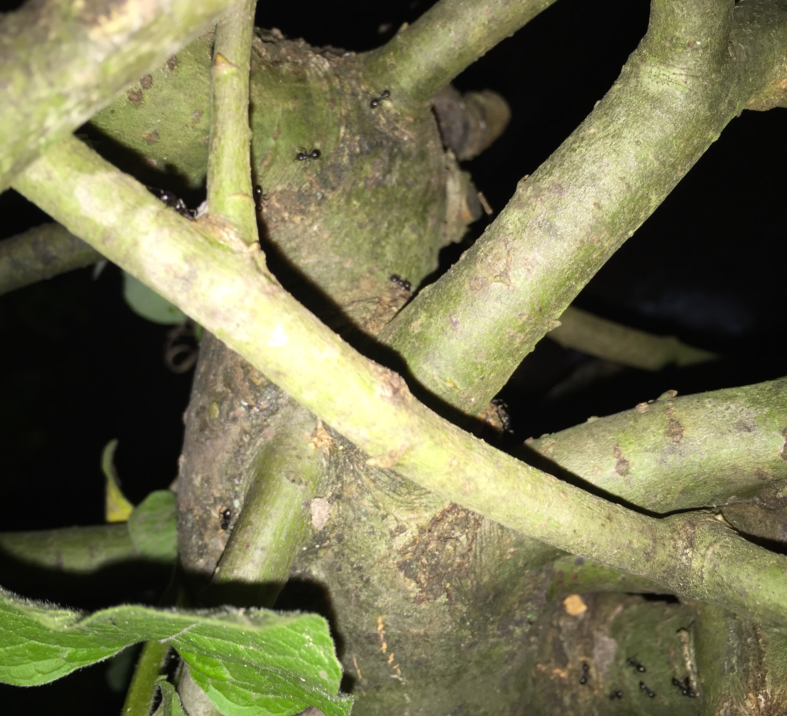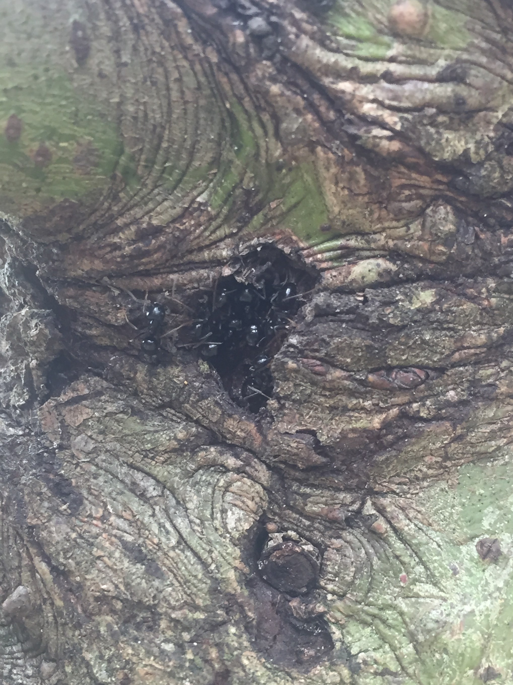 Hunderte Lasius niger* umzingelten den Stamm und gingen langsam aufwärts.
