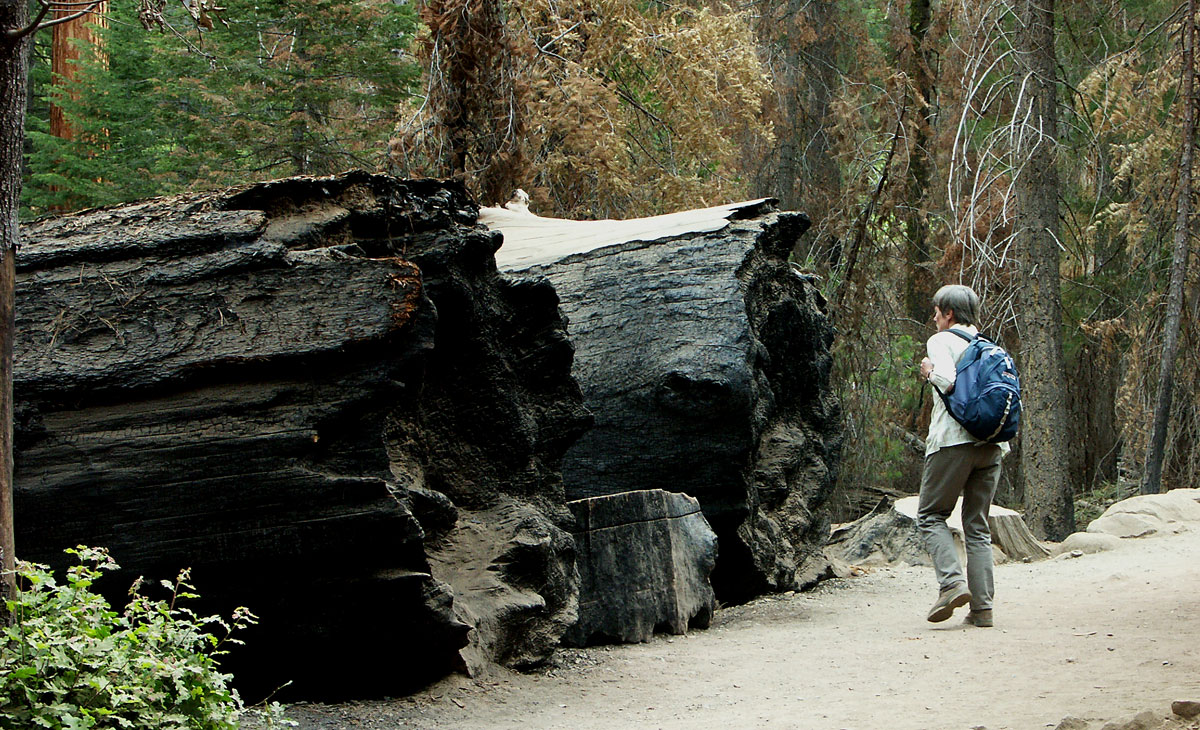 Der „General Sherman“ war, wie etliche andere Exemplare, auch mal vom Bltz getroffen worden, hat den Wipfel verloren und ist im Inneren ausgebrannt.