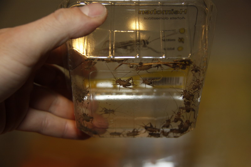 Nach ca. 10 min sind etliche Heimchen aus dem Nest gekrabbelt und in die TĂŒte gefallen, an der sie auch nicht wieder hoch kommen.