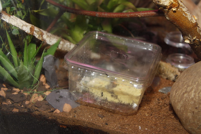 Die Ameisen finden zwar die Schachtel interessant aber rein gehen tun sie nicht. Das ist schon mal gut, aber auch keine Heimchen.