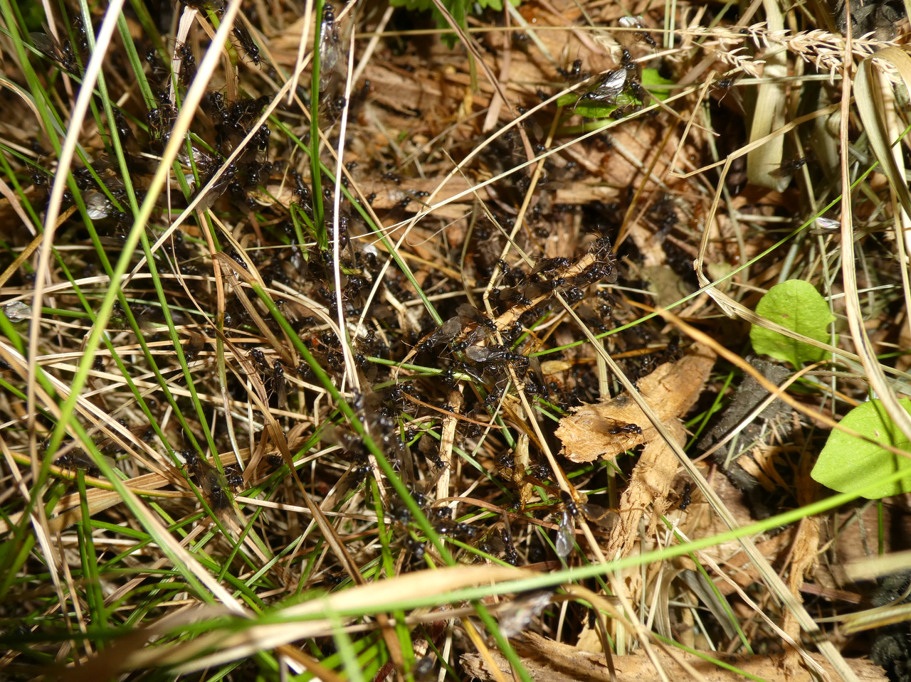 Ich wusste ja, dass heute definitiv irgendjemand schwärmen wird bei dem schwülen Wetter, aber was ich am Straßenrand zu sehen bekam, war doch ein eher kurioser Anblick. Hunderte Männchen (Lasius?) verließen ihr Nest und flogen davon. Es soll ja bei vielen Arten üblich sein, dass die Männchen zuerst losfliegen, aber hier war nicht eine Gyne oder Arbeiterin zu sehen!