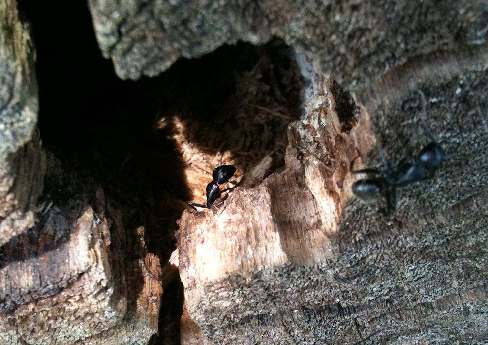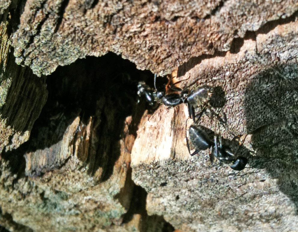 Hier sieht man deutlicher die MĂ€nnchen die sich vor dem Eingang zu ihrem Baumstammzuhause tummelten.