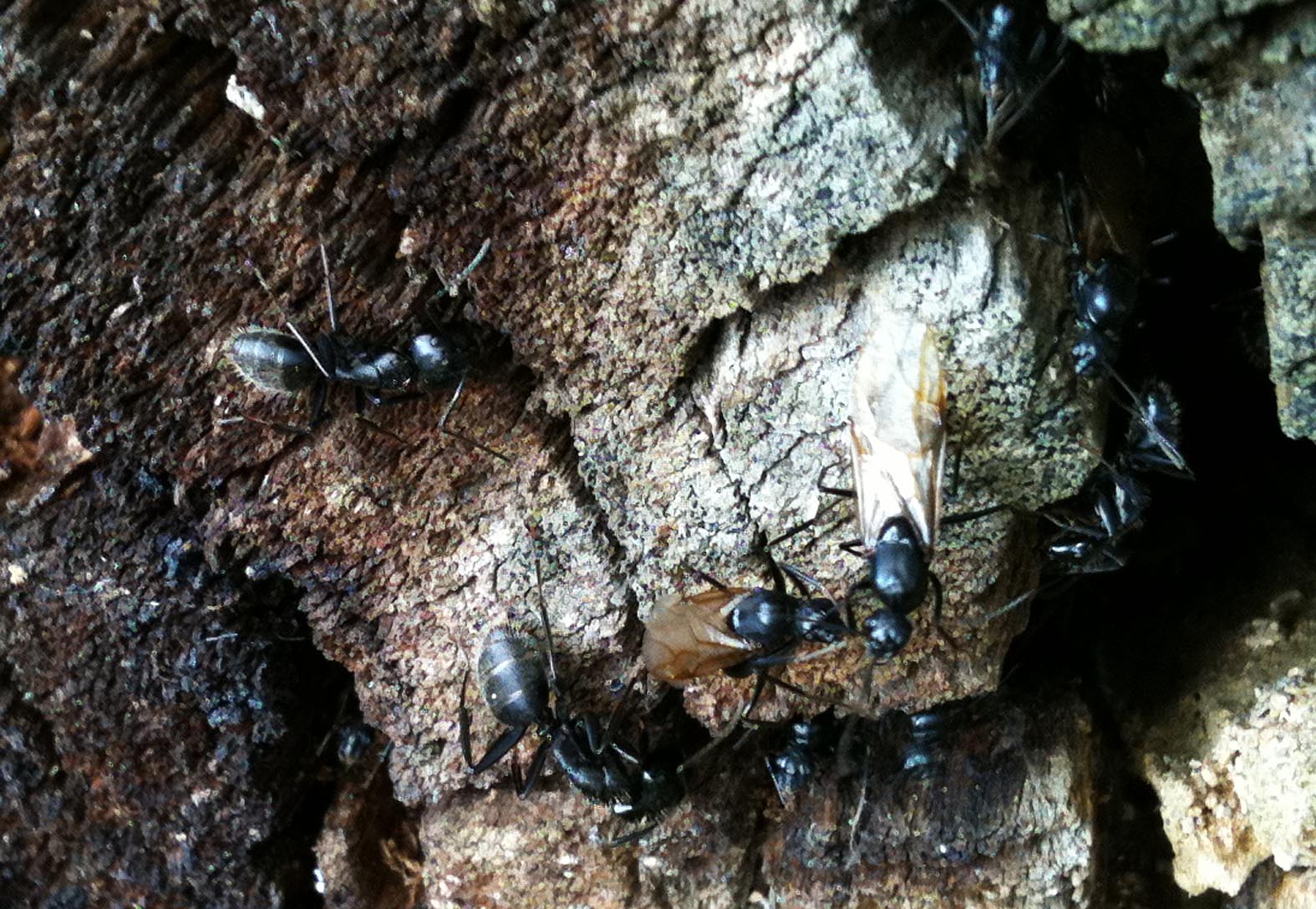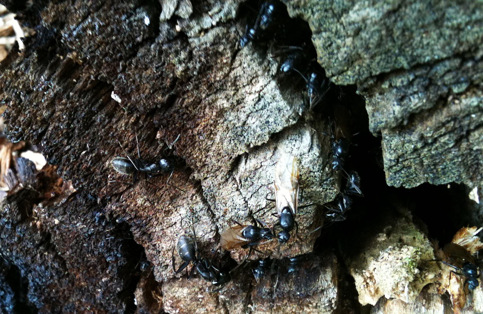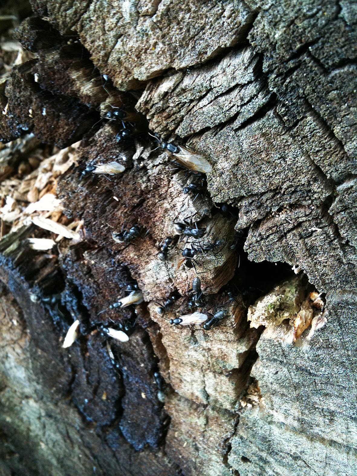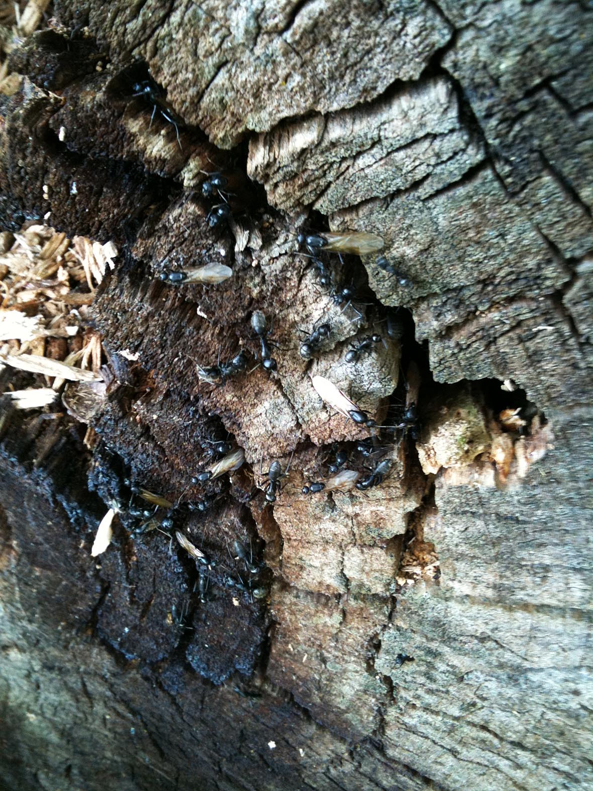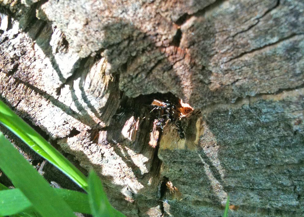 Warum der Baumstumpf derart massiv im Bereich der Ansiedlung zerstört worden ist - kann ich leider nicht sagen. Ich hoffe das Völkchen konnte sich in Sicherheit bringen.