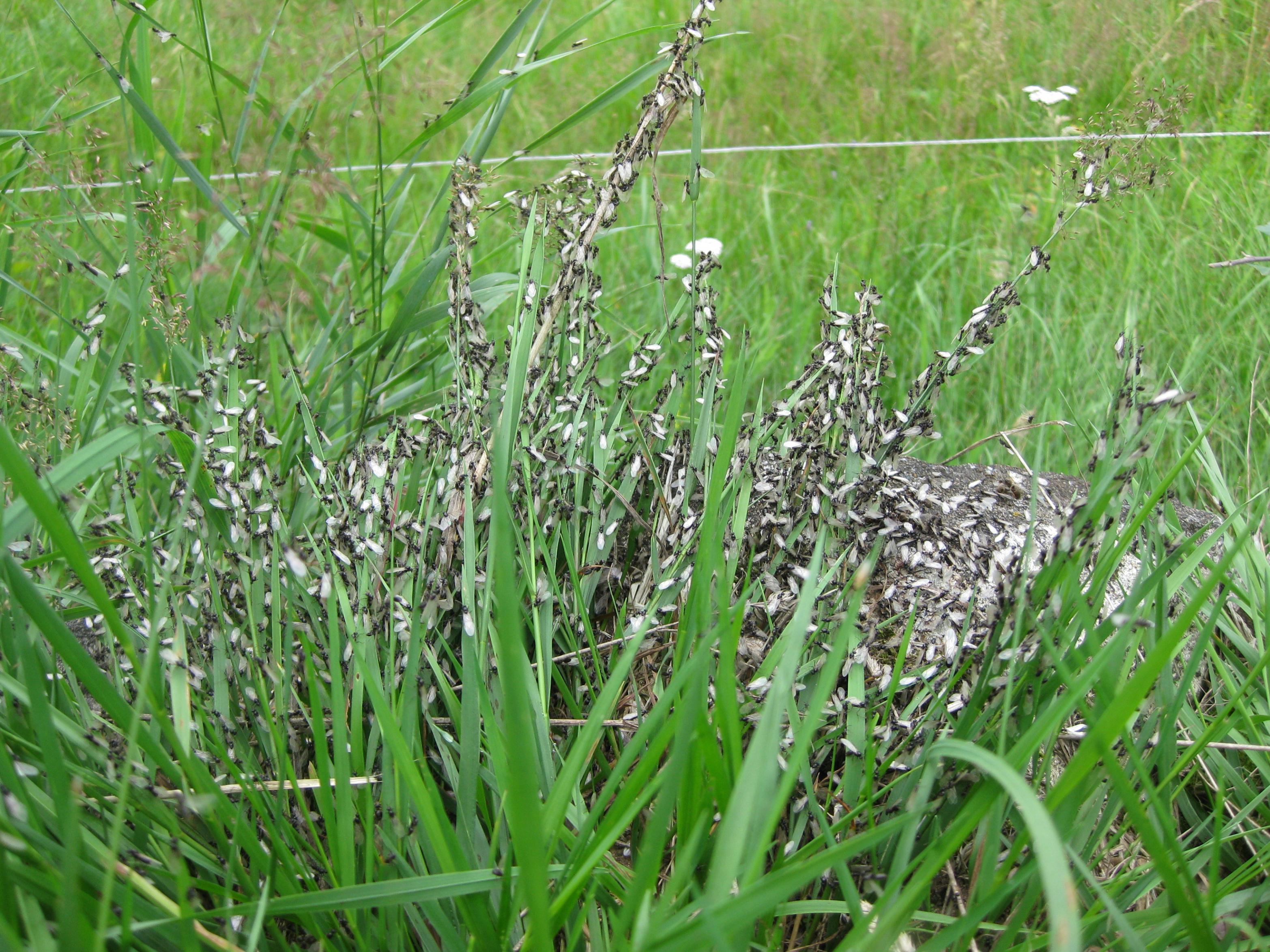 Ich konnte zumindest die Vorbereitungen zum Schwarmflug beobachten. Es tummelten sich einige hundert Arbeiterinnen und ein paar Geschlechtstiere auf dem großen Findling, in und unter dem sich das Nest befindet. Normalerweise sieht man hier nur zwischen 10 und 20 Arbeiterinnen herumlaufen. Ob die Geschlechtstiere später wirklich abflogen kann ich aber nicht sicher sagen.