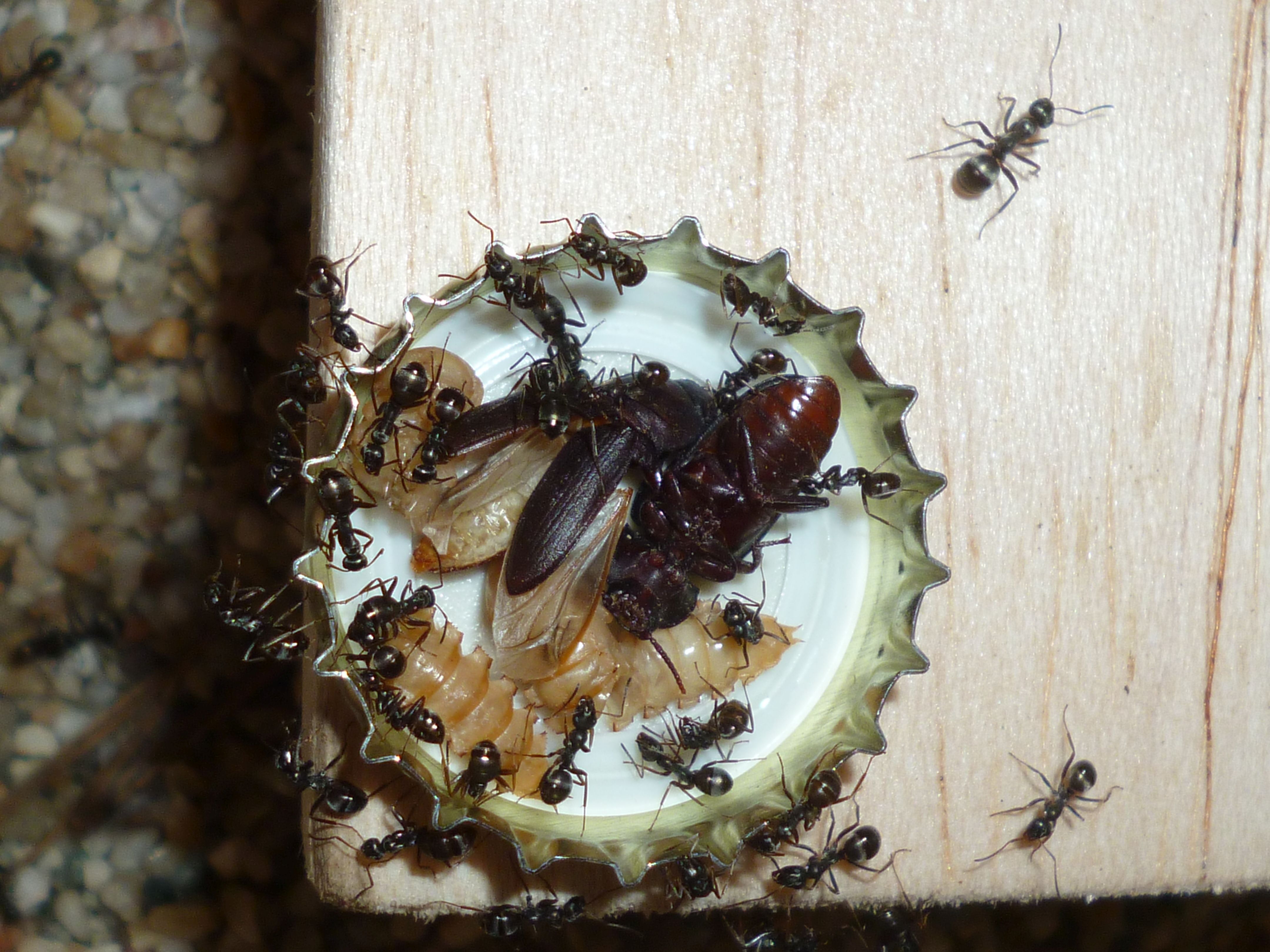 Da sieht man jetzt wie meine Ameisen auf Mehlkäferpuppen und Imagines abgehen. Ich habe irgendwo auch noch ähnliche Fotos mit Mehlkäferlarven, bin grad nur zu faul zum Suchen![]()