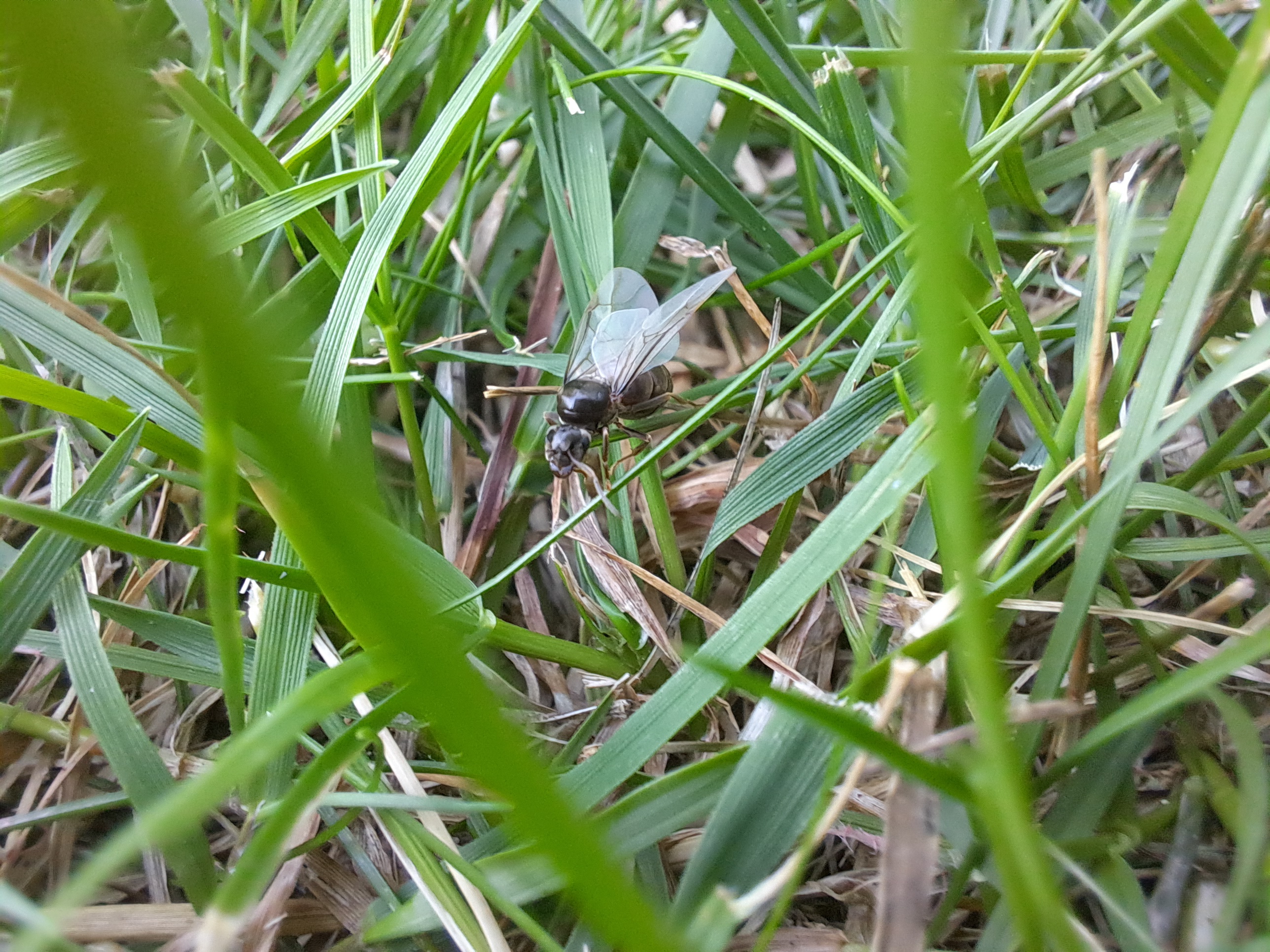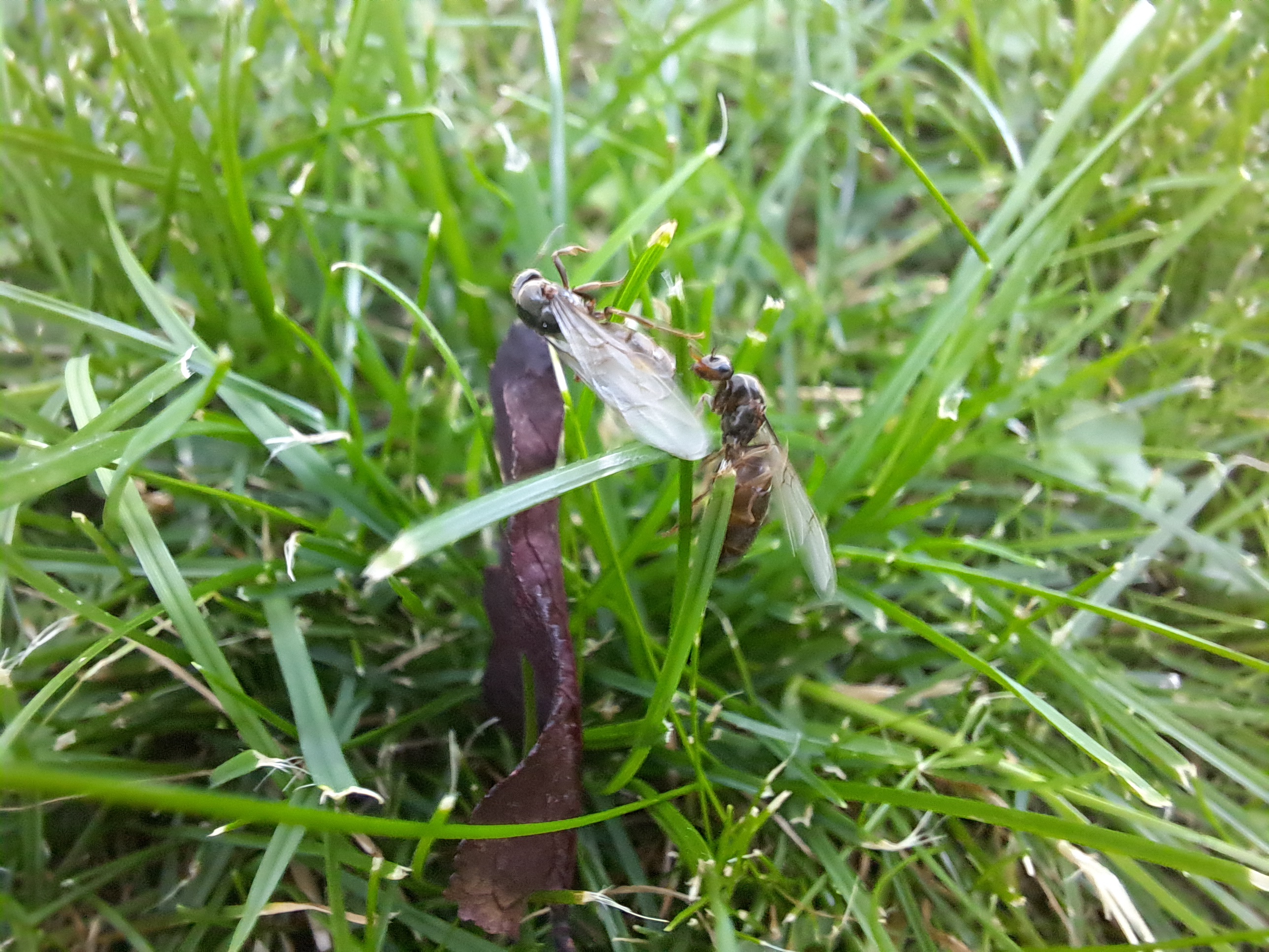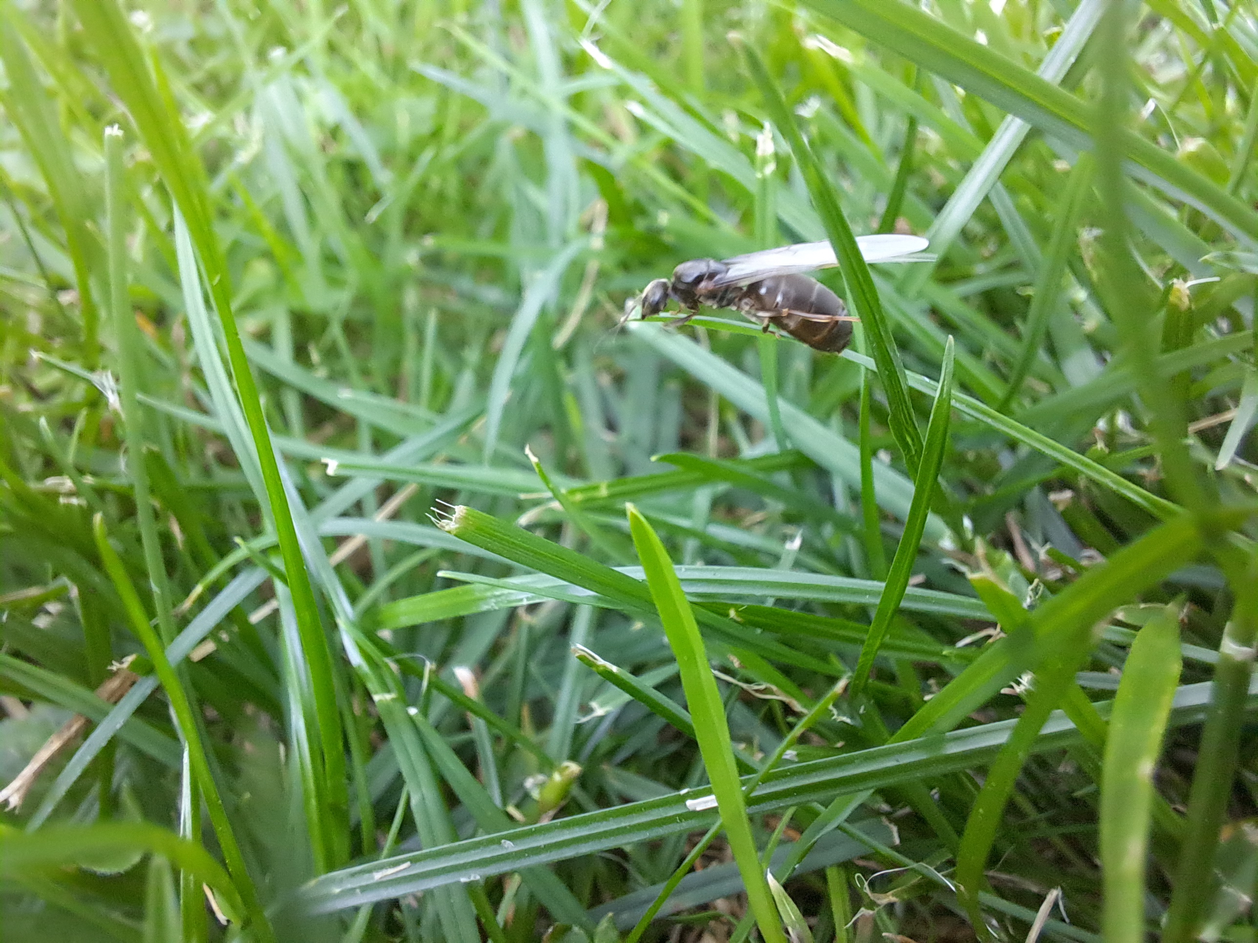 Hunderte, wenn nicht tausende Alate in der Luft und stellenweise etliche dealate Gynen auf dem Boden. Auf meinem Rückweg sah ich auch über anderen Wiesen noch letzte Schwarmaktivität. Nach den endlosen Regenfällen der letzten Tage und auch letzter Nacht müssen die Nesteingänge wirklich fix wieder geöffnet worden sein. Selten so einen nervtötenden Rasenmäher gehört.