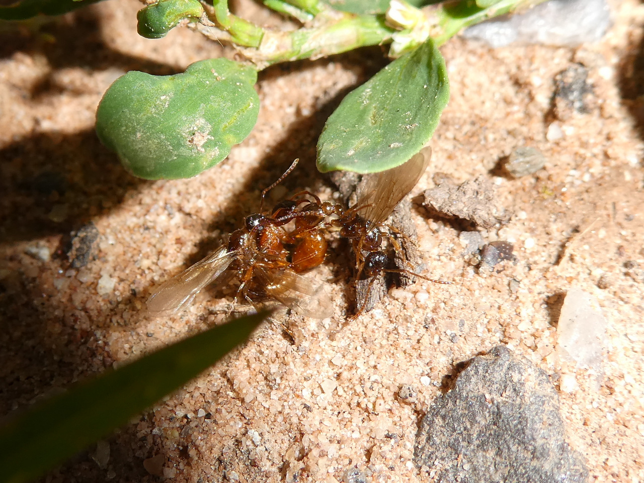 Etliche fielen den auf den Wegen nistenden Tetramorium zum Opfer. Bei der ganzen Aufregung kamen auch einige Männchen letzterer hervor. Hier der direkte Größenvergleich zwischen den Männchen beider Arten:
