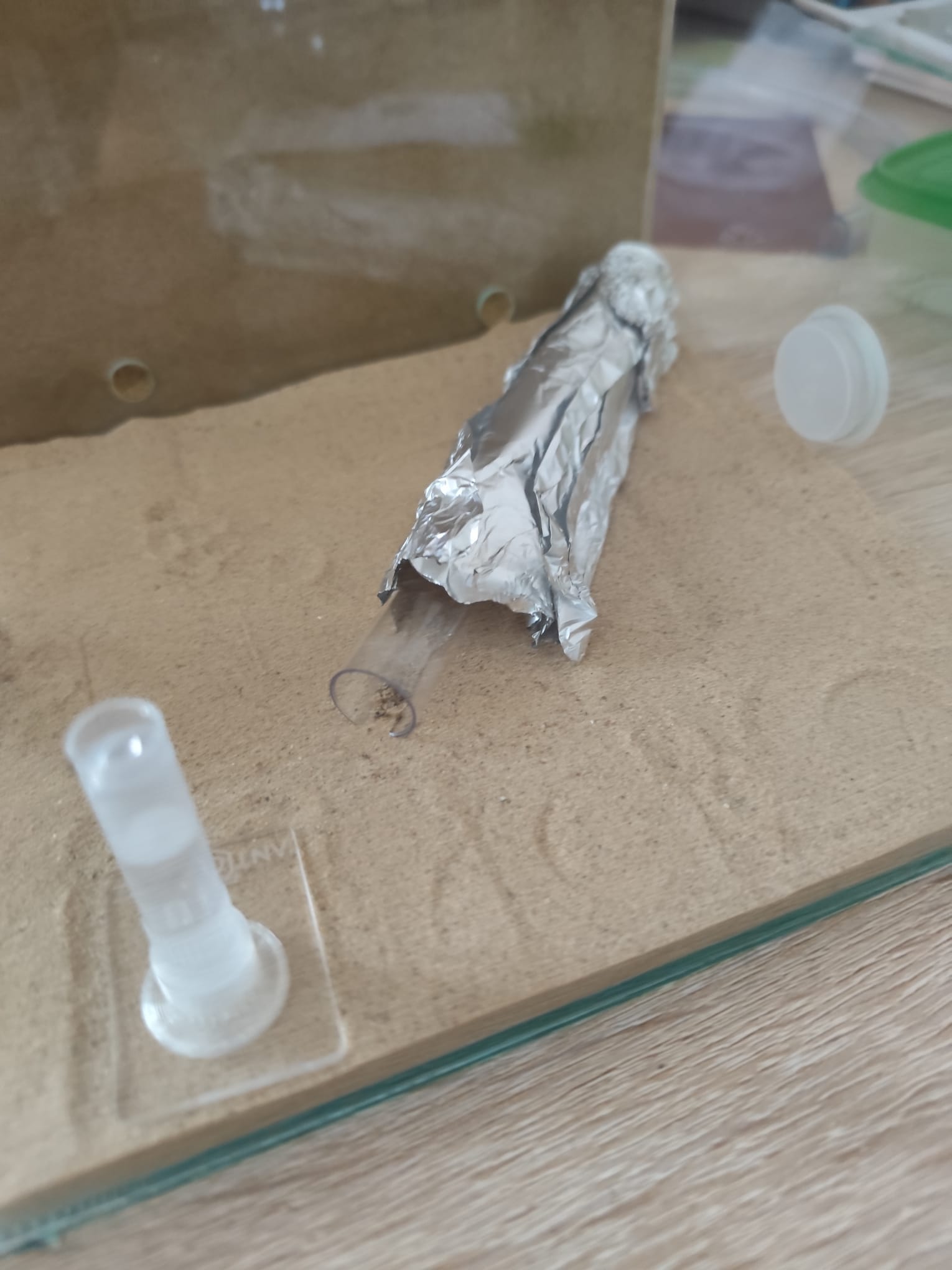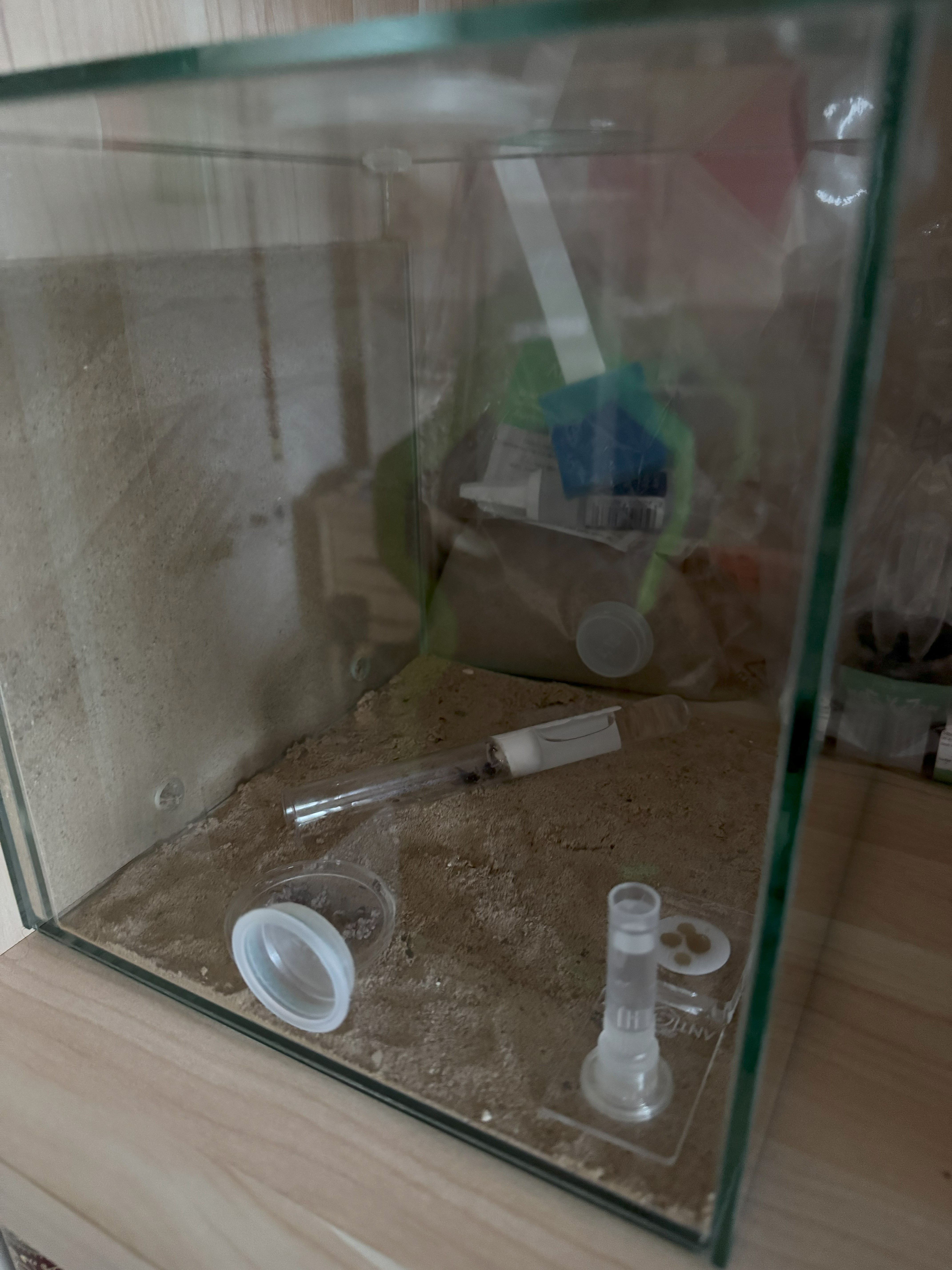 Aktuell ist das Reagenzglas mit seinem Mikroklima praktisch das Nest / Zuhause der Kolonie. Könnte noch etwas dauern, bis die in die Farm-Rückwand einziehen.