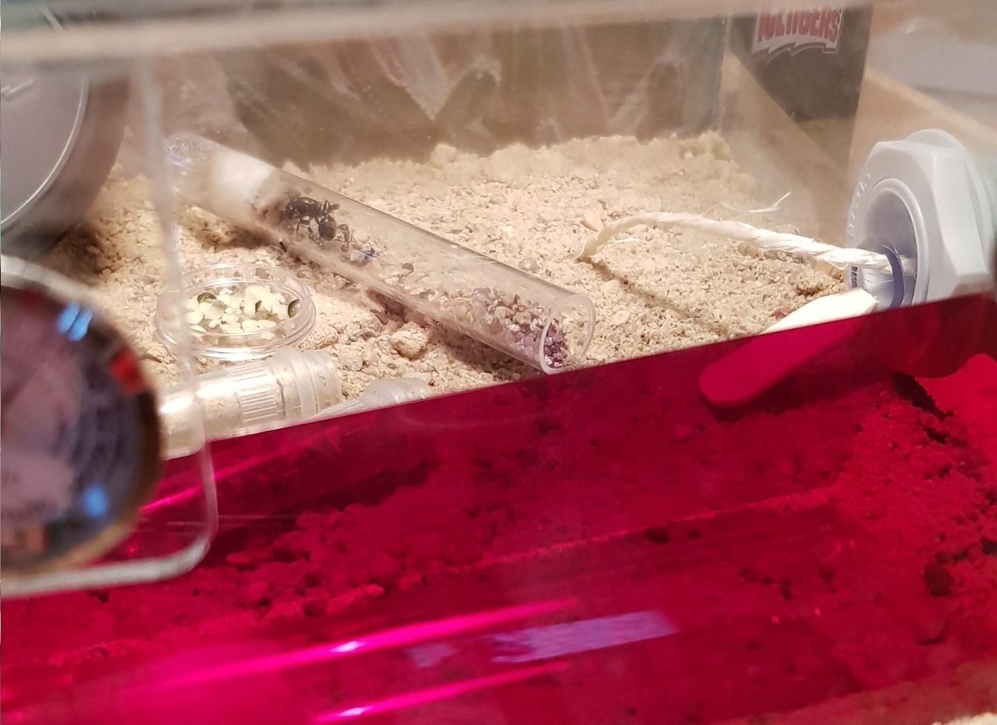 An Futter das verderben kann ist nur noch ein bisschen befeuchtetes Insektenprotein vom Antstore drin (nehm ich morgen raus), ansonsten nur Minor-Körnermischung und Wassertränke.