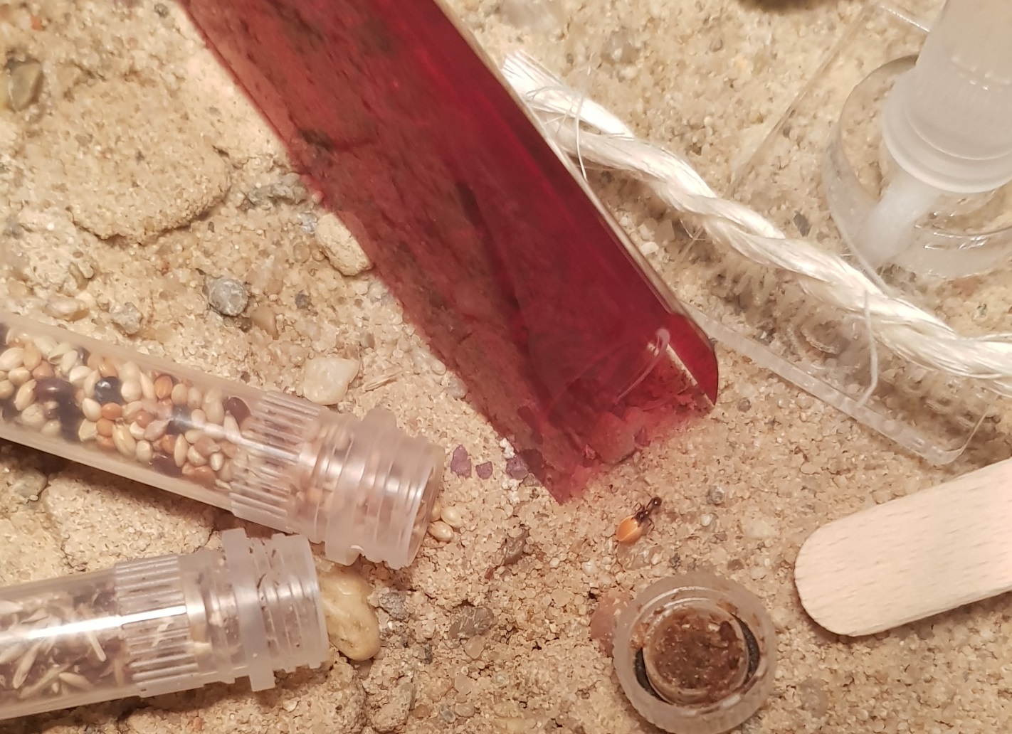 So als kleinen Versuch hab ich ihnen, bevor ich den Deckel wieder drauf gemacht hab, noch ein Futterröhrchen mit Media-Körnermischung reingelegt.