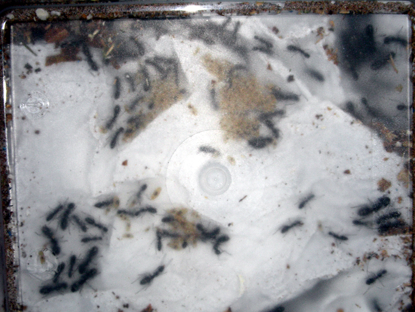 Foto5: Von unten sieht die Box so aus. Man beachte die großen Larvenhaufen (gelblich/braune) am Boden.
