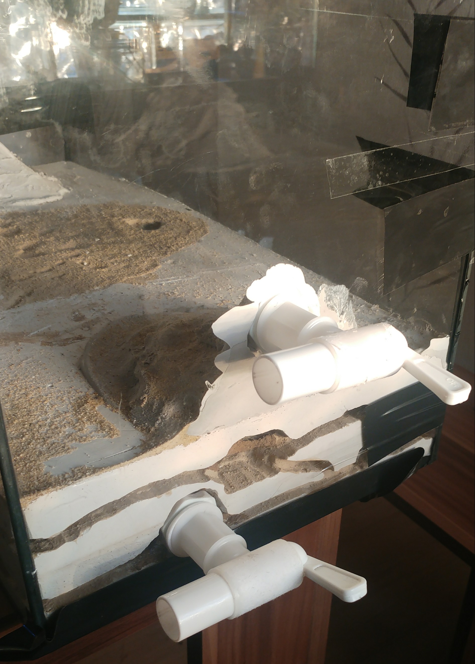 Habe drei Bohrungen am Aquarium vorgenommen, Eins als Erweiterung später, eins für die Nest belüftung und das letzte für die Bewässerung.