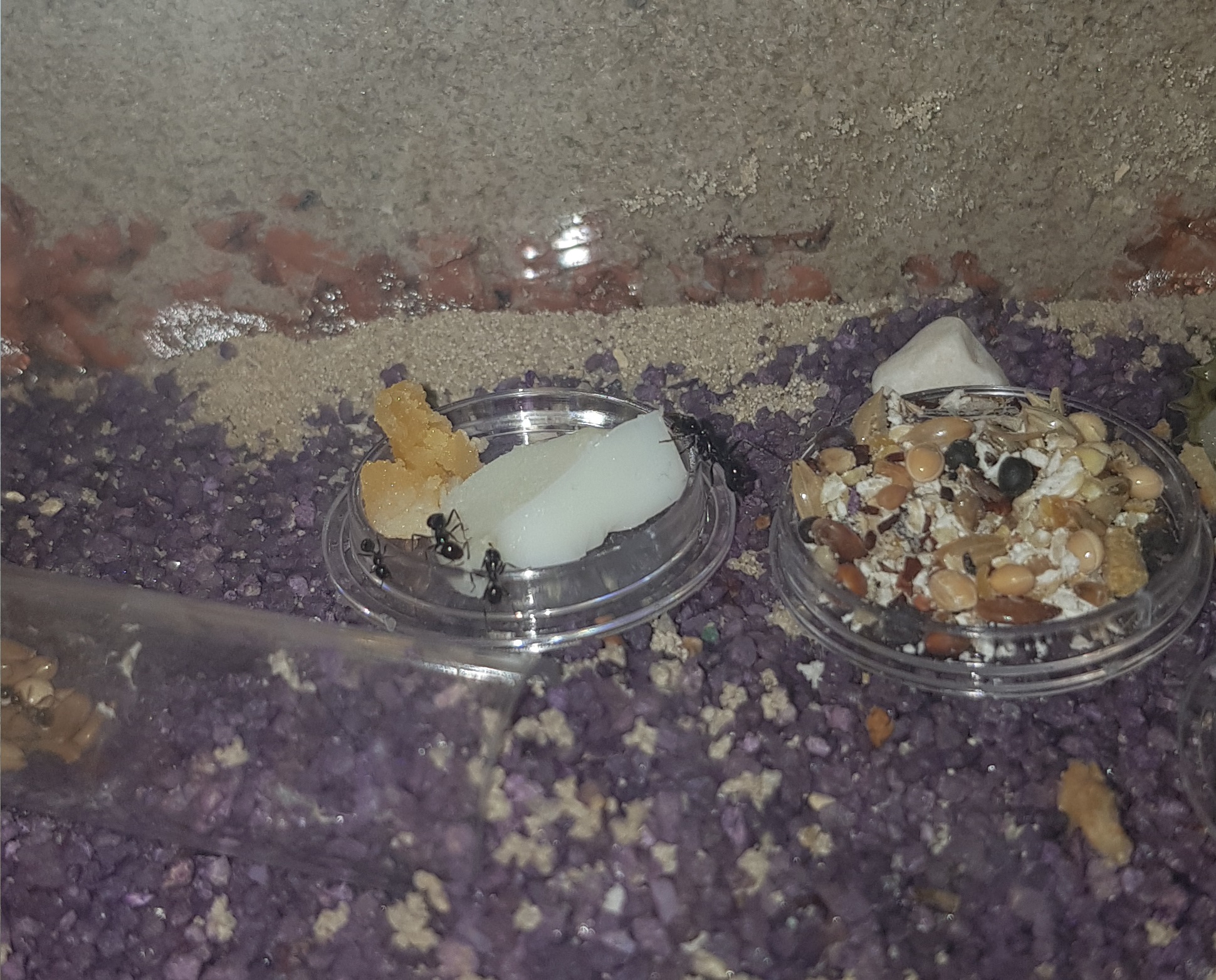 Selbst Futter- und Wasserwechsel (mittels langer Pinzette, immer komplette Näpfe austauschen - die 20mm Näpfe vom Antstore sind für den Anfang echt großartig!) bringen sie nicht erwähnenswert aus der Ruhe.