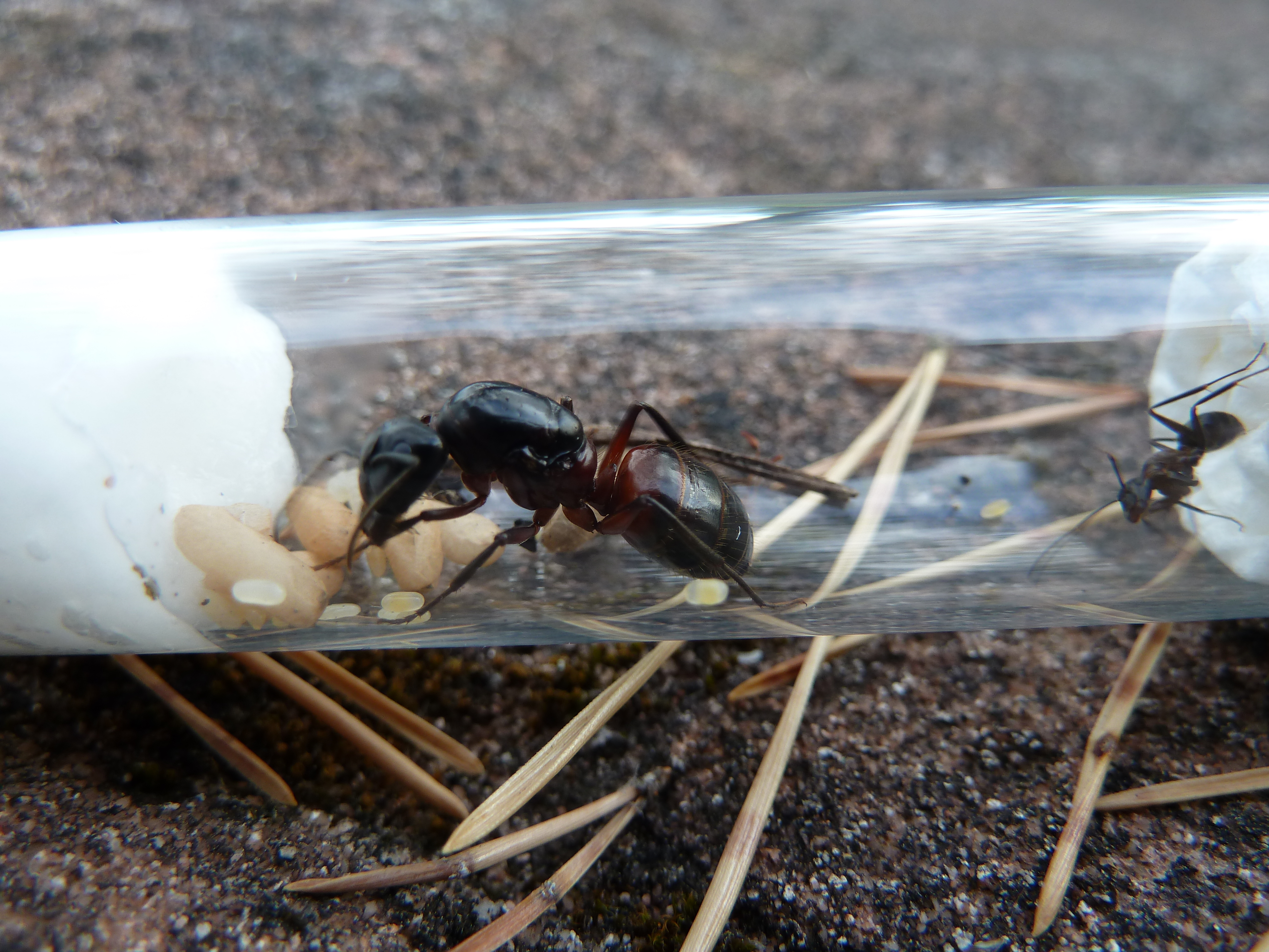 Häufchen Eier besteht. Die Gyne zeigte sich, sobald sie im RG war, überraschenderweise sogar kooperativ, nahm die Puppen, die ich ihr