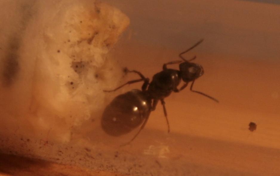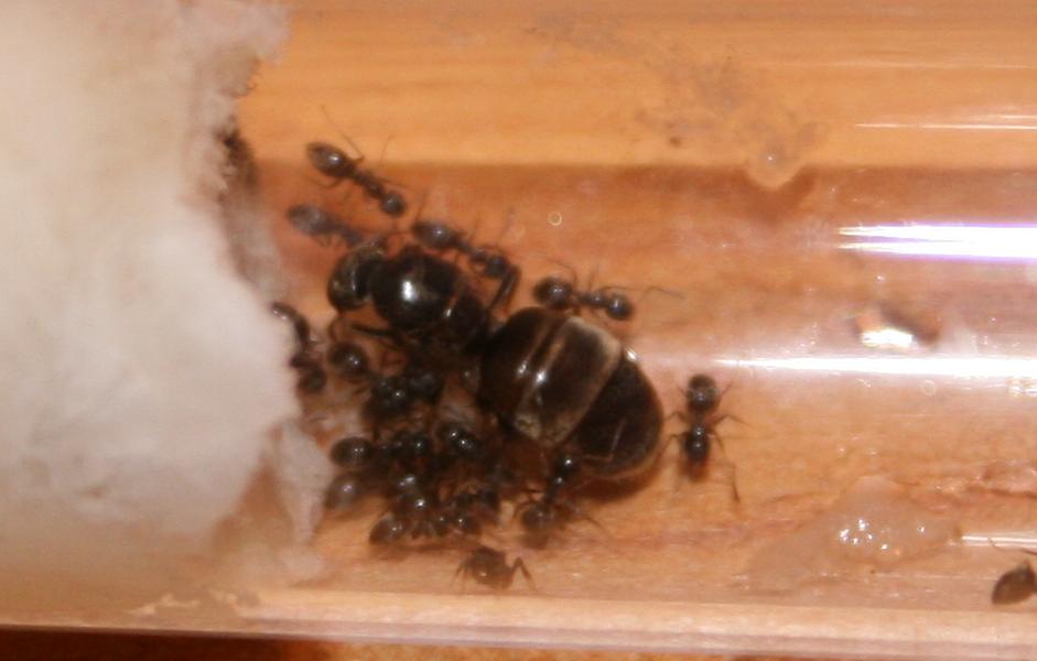Ein zerteilter Mehlwurm wurde auch angefressen. Ich hab gelesen, dass Lasius flavus in der Natur von der Wurzellauszucht lebt