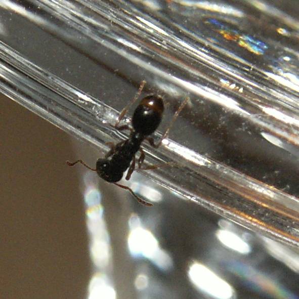 Die 2. Art: GröĂe der Arbeiterinnen ca. 0,2 cm. Sie sind durchgehend schwarz. Sie bewegen sich sehr langsam. Kein Vergleich zur 1. Art. Viellecht hĂ€ngt es mit der GröĂe zusammen. Der Kopf ist etwas gröĂer als die Gaster und die hinteren Beine sind sehr kurz. Auf einem Foto sieht man an der Gaster einen braunen Streifen