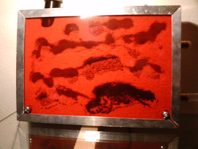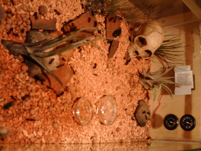 Später habe ich diese dann in ein 60 x 30 Formicarium umgesiedelt, das mittels eines Schlauches an zwei 30 x 20 x 5 Ytong Nester angeschlossen ist. Eines davon ist partiell leicht beheizt (3 W). Ein 10 x 20 Formicarium ohne Einstreu dient als 'Müllhalde'. Das große Formucarium ist ca. 2 cm hoch mit runden Blähton (Duchmesser ca 6 mm - 10 mm) gefüllt, darüber eine Schicht granuliertem Blähtons, mit ca 2 mm - 5 mm Korngröße. Als Verstecke wurden einige flache Ziegelstücke aufgehäuft. Die Ameisen haben sich zunächst darunter verkrochen und dort die
