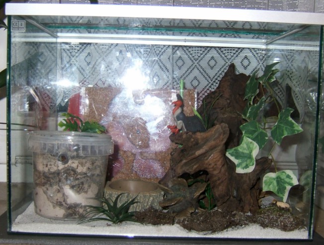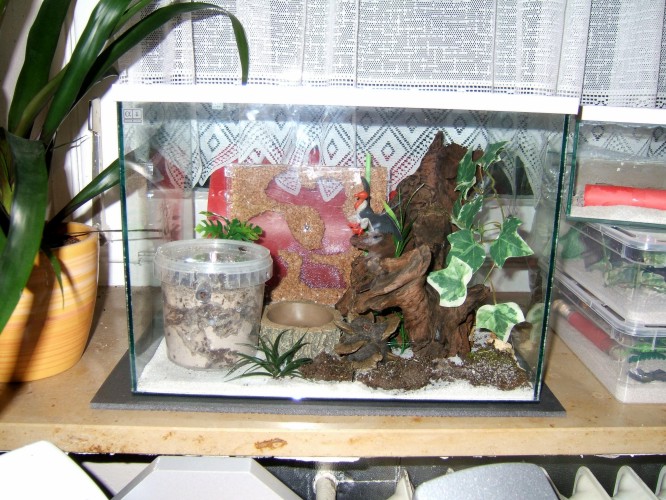 Ich hab versucht das genau zu fotografieren, aber die Kamera ist zu schlecht, daher nur Bilder allgemein von dem Becken, es ist 35 x 25, das Nest ist aus Gips, das hab ich vom vorigen Halter übernommen (danke Mesut ;-) und ich hab noch eins reingestellt, um zu testen, wie die ein selbstgemachtes Korknest finden, aber bisher ist es unbewohnt.