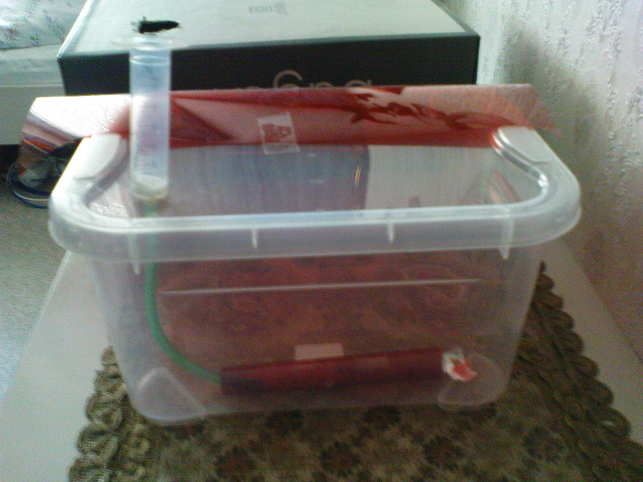 Ne, Glas is nicht so gut. Glas ist kein natürliches Material, in dem Ameisen in der Natur leben. Nachdem ich das Reagenzglas ins Formikarium gelegt hatte, haben die Arbeiterinnen als erste Handlung den Eingang zugebaut. D.h. sie wollten es dunkler haben. Selbst das bißchen Licht am Eingang war zu viel. Und in meinem Konstrukt hatte ich noch extre rote Folie außen. Man sieht sie auf dem Bild.