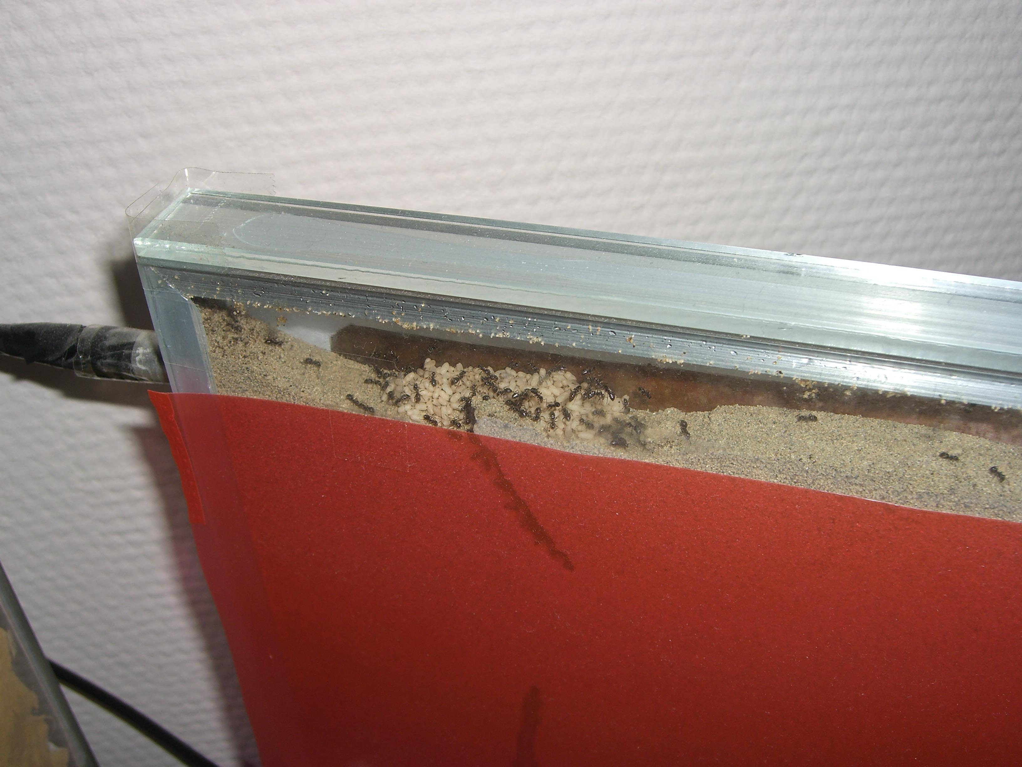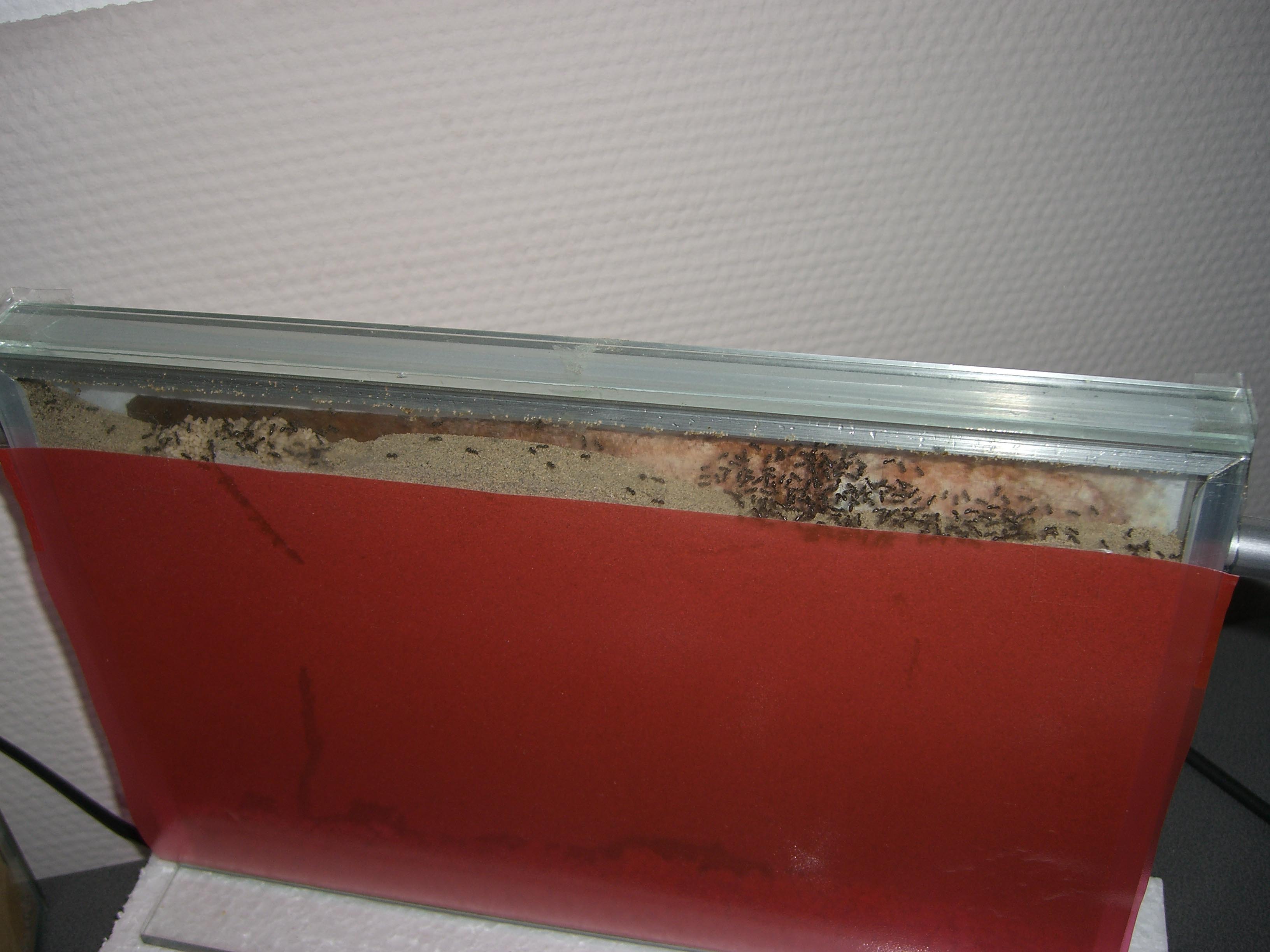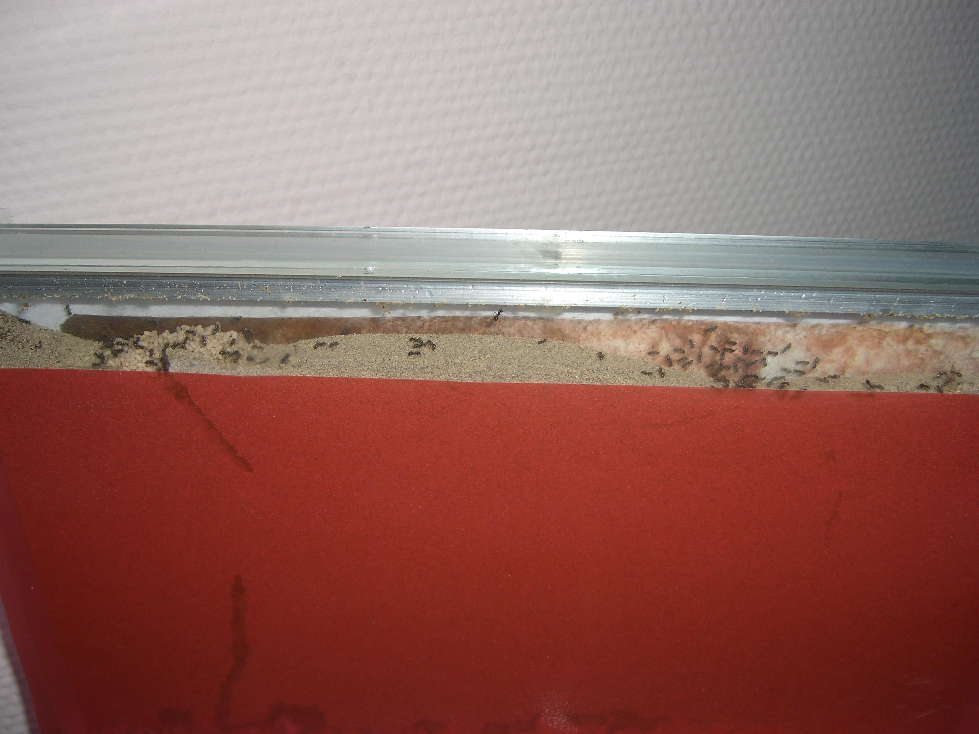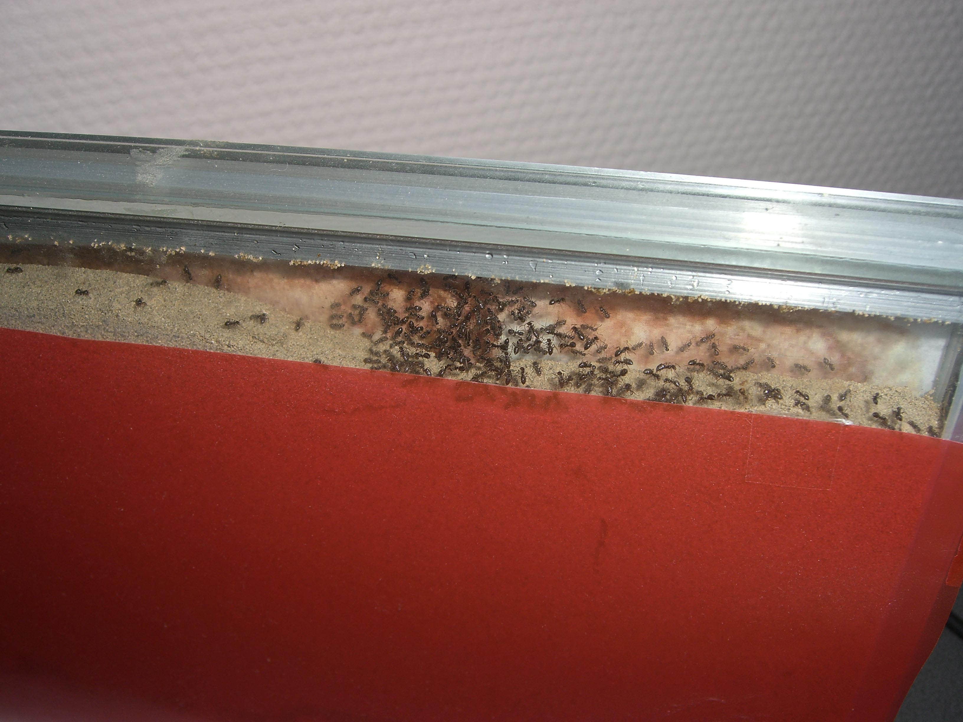 Soweit auch noch nicht schlimm. Allerdings sammelten sich immer und immer mehr Arbeiterinnen am 2. Ausgang des Nestes. Nun war ich fĂŒr 1 Woche in Urlaub (mein Dad hat die Meisen solange gefĂŒttert und umsorgt) und mittlerweile sammeln sich am besagten 2. Eingang geschĂ€tzte 50 Ameisen und machen nichts. Ich kann in der Glasfarm auch nicht erkennen, dass sie weitere GĂ€nge bauen o.Ă€., aber die vorhandenen GĂ€ngen und Kammern sind proppevoll mit Ameisen. Herrscht Platzmangel und die Ameisen weichen auf die OberflĂ€che aus? Eigentlich nicht möglich, da in der Farm noch jede Menge Platz fĂŒr weitere GĂ€nge und Kammern ist.