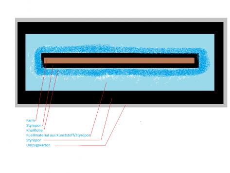 Den Raum Zwischen Farm und den 7,5cm dicken Styroporplatten habe ich mit Verpackungsmaterial befuellt.