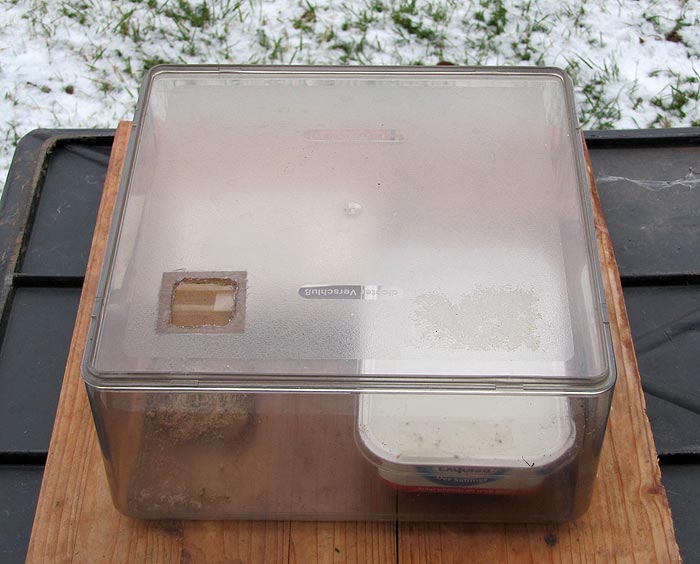 In der Garage sind die Tiere nun seit Mitte Oktober, 3 ½ Monate, und machen einen „guten“ Eindruck. Die Temperatur wird mittels Frostwächter so eingestellt, dass bei 0 °C außen in der Garage noch knapp 5 °C herrschen. Bei starkem Frost (bisher bis minus 15 °C) sinkt die Temperatur auf minimal 3 °C; wenn gelegentlich die Sonne ins Garagenfenster scheint, werden für 2-3 Stunden ca. 14 °C erreicht (ein Minimum-Maximum-Thermometer hängt etwa in gleicher Höhe wie der Standort der Ameisen). Das „Formikar“ wird nicht von der Sonne erreicht.