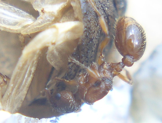 Sie hatte keine FlĂŒgel mehr, krabbelte ĂŒbers Pflaster und hatte eine tote Arbeiterin zwischen den