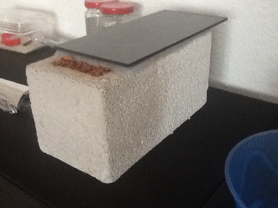 2) Thema Feuchtigkeit im Nest: Das Nest wird zu exakt 50% über die Bewässerungsmulde mit Feuchtigkeit versorgt. Dort sitzt die Königen und der Rest der Truppe. Der andere/trockene Teil ist nicht besetzt. Morgens und Abends mache eine einen kleinen Schuss Wasser in diese Mulde. Damit ist die Aussenfarbe des Ytongs zu 50% weiß und zu 50% grau. Reicht das aus, oder sollte ich mehr bewässern? Braucht ihr Bilder?