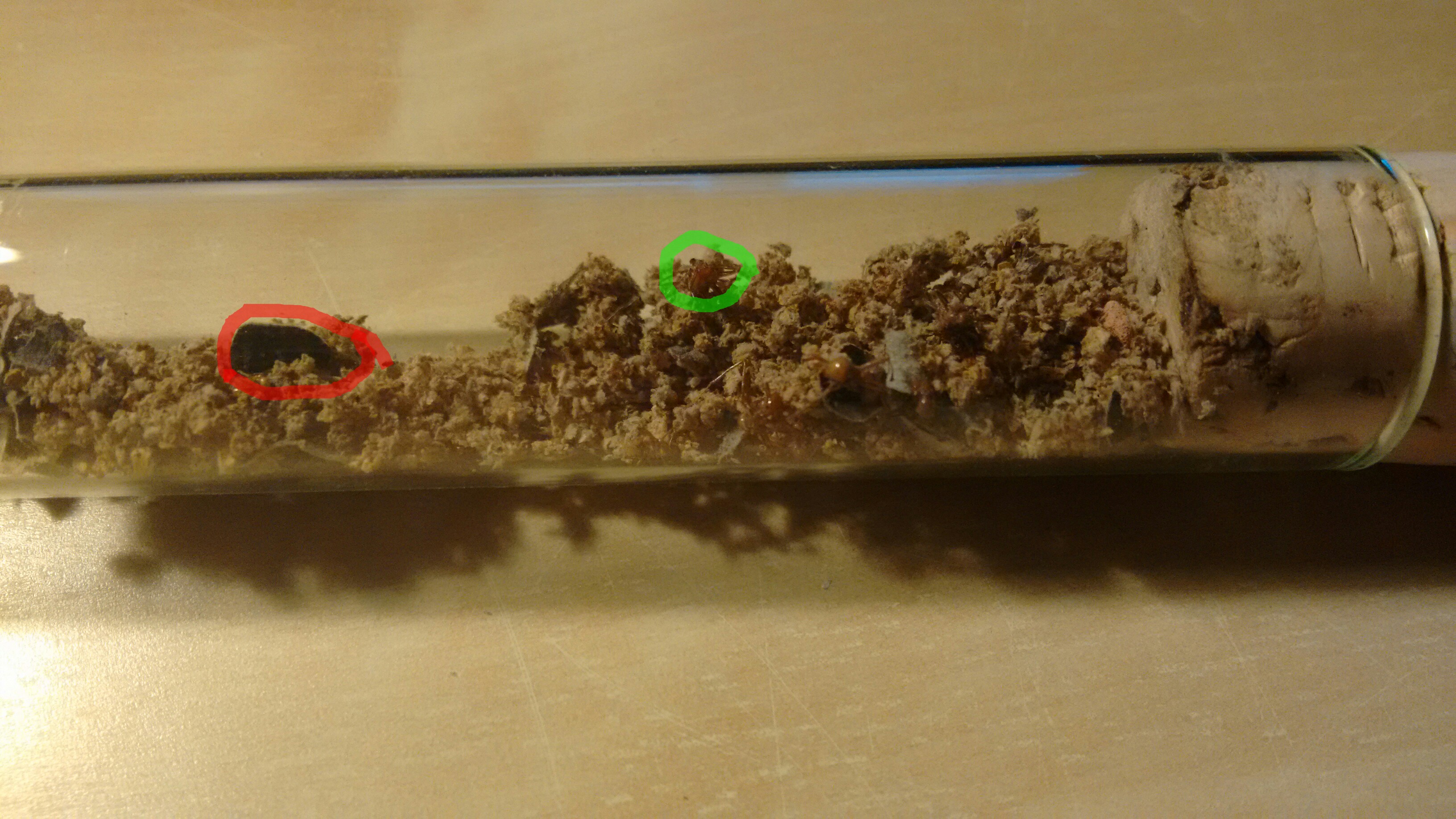 Rot: Blätter<br />Grün: Eine Verstorbene Arbeiterinn<br />Und der Rest ist großteils Pilzabfall.