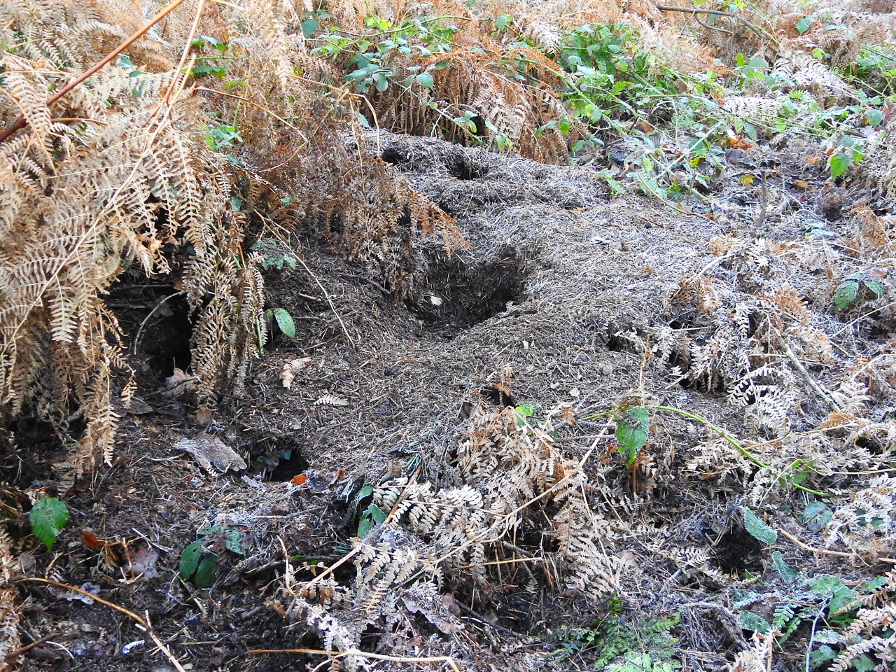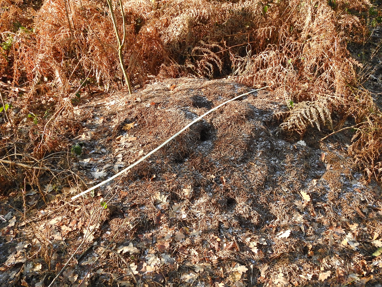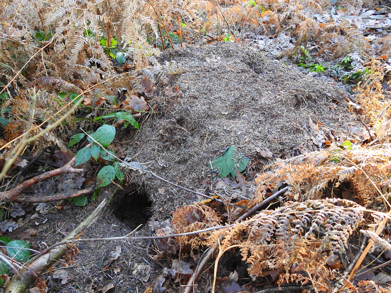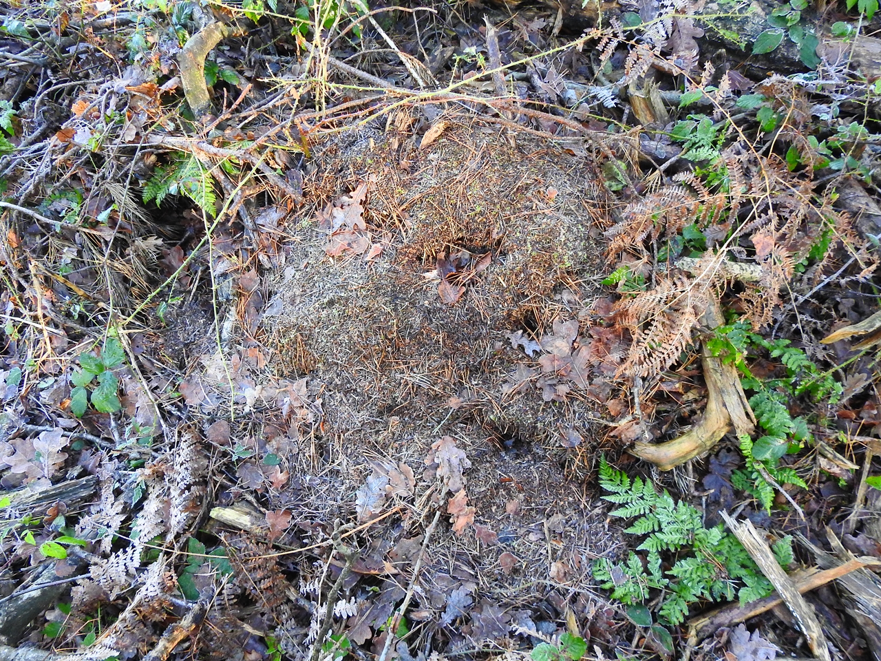 Zur Nestdichte, na ja es ist nicht so, dass mal alle drei Meter über ein Nest stolpert. Ich würde schätzen, dass etwa alle zwanzig bis fünfzig Meter ein Nest zu finden ist. Diese Aussage ist jetzt aber wirklich nur grob geschätzt, da ich noch nicht versucht habe sämtliche Nester zu finden und auch noch kein Maßband in die Hand genommen habe. Momentan ist das auch unmöglich da ein Großteil des Bodens mit Laub bedeckt ist. Es handelt sich hier um einen Mischwald, es sind viele Fichten aber auch Eichen usw. vorhanden.