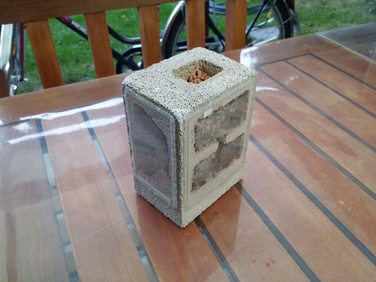 An den Scheiben hat sich viel Kondenswasser gebildet. Die Ameisen sind zum Teil in den Zwischenraum der Scheibe und der Trittplatte gewandert. Auf dem Bild nicht zu erkennen, die vielen Ameisen im Hohlraum am Nestblock. Ich vermute den Großteil der Kolonie im unteren Teil des Y-Tong Steins.