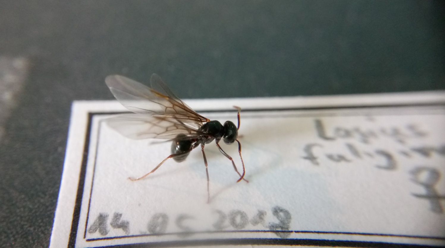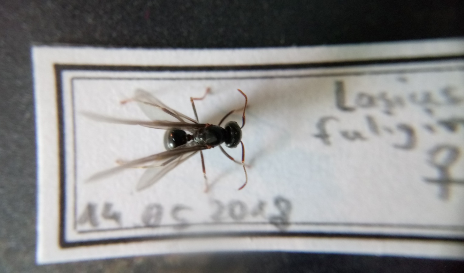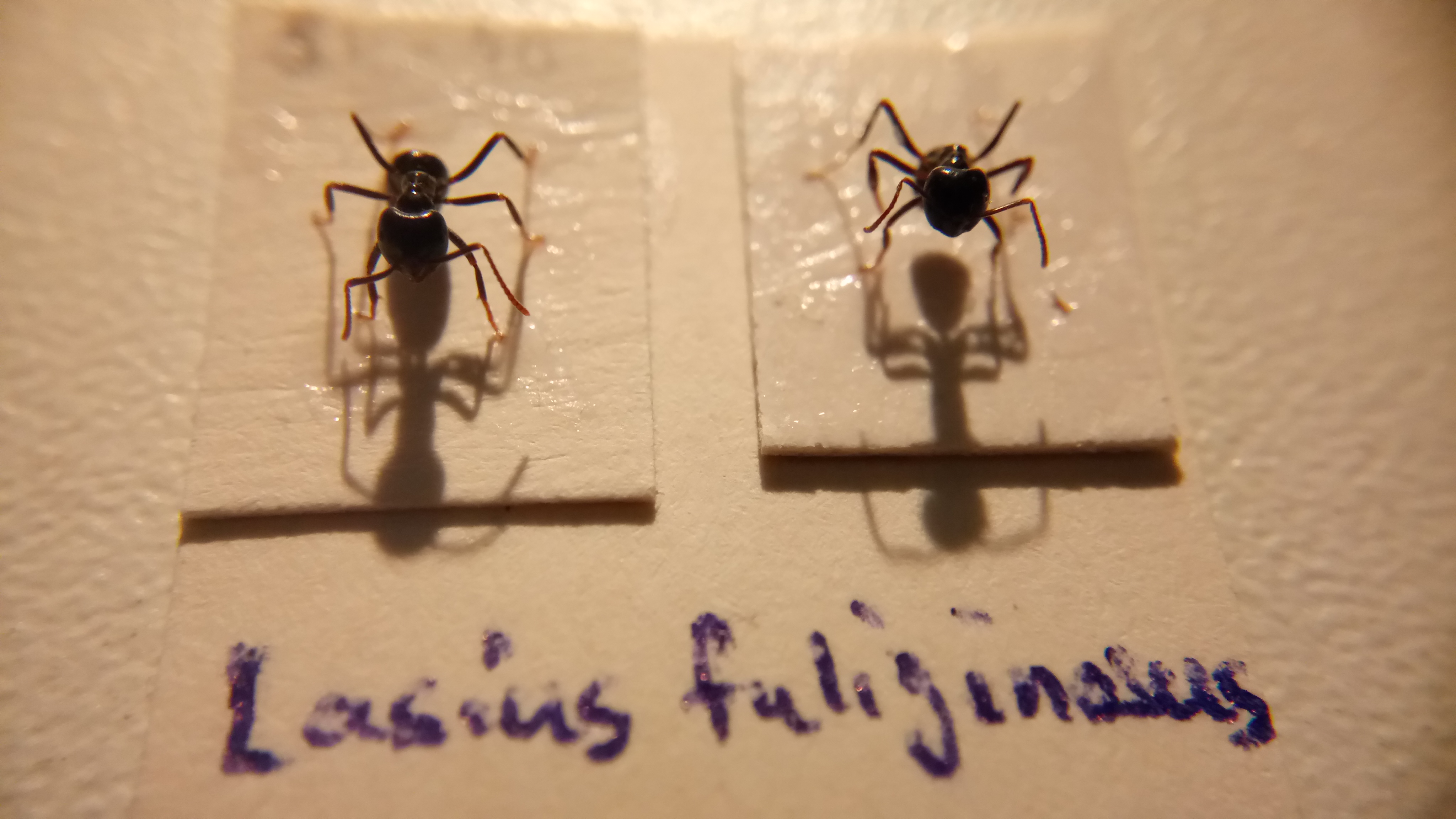 Es handelt sich um eine Lasius fuliginosus, ich habe mit Nadeln vorsichtig die Beine gerichtet, dann habe ich die Beine an ein Stück Pappe geklebt, nun lasse ich sie eine Woche an der Luft trocknen.